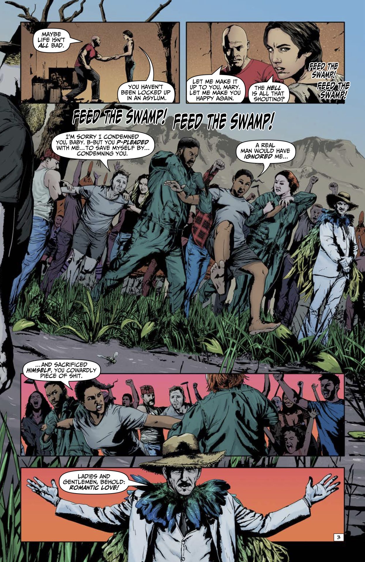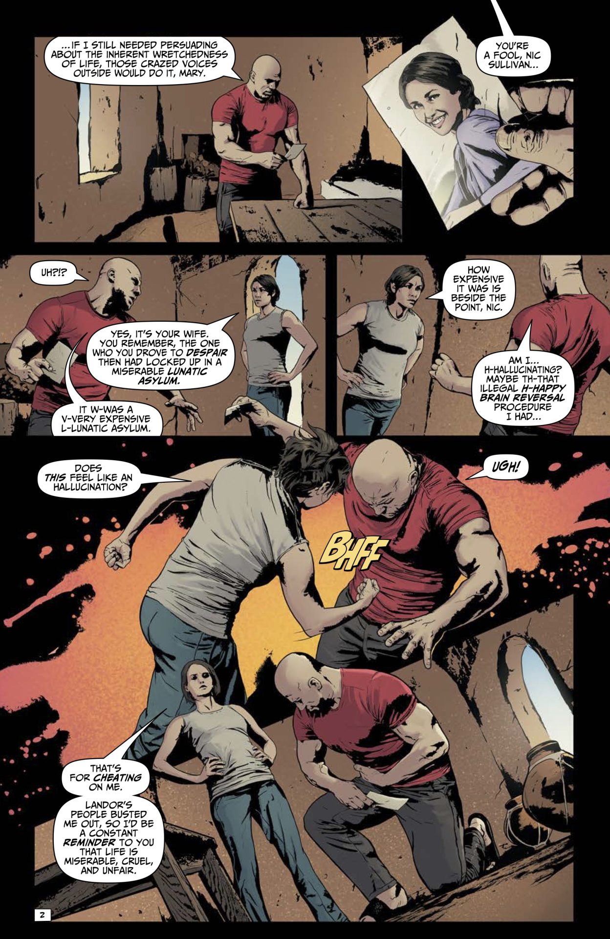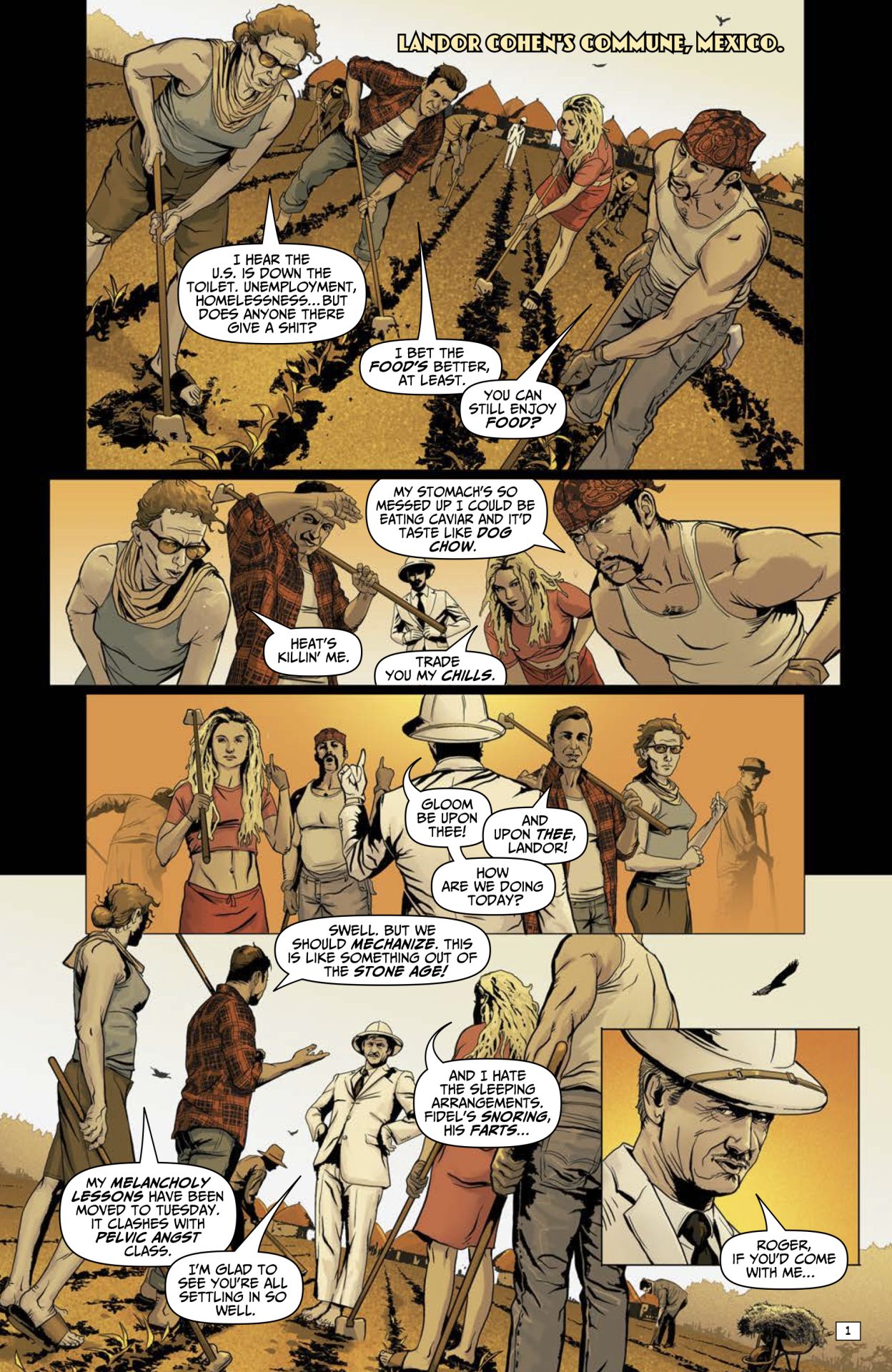 Michael Montenat’s mixture of caricature and photorealistic art a la Michael Gaydos (Alias, Pearl) is well-suited for the terrifying supporters of the Joy Police and the status quo with their rictus grins and laughs that look like those infamous stock photos of women laughing at salad instead of genuine merriment. Colorist Sobreiro adds a little juice to the line work during any of the torture or indoctrination scenes from regular electric shocks to a truly traumatizing treatment that is enacted on Hamm towards the end of the issue as the guards grow tired of him jabbering about Landor Cohen. He turns on the reds and then returns to skin tone and then reds again as Milligan and Montenat drop the issue ending cliffhanger.