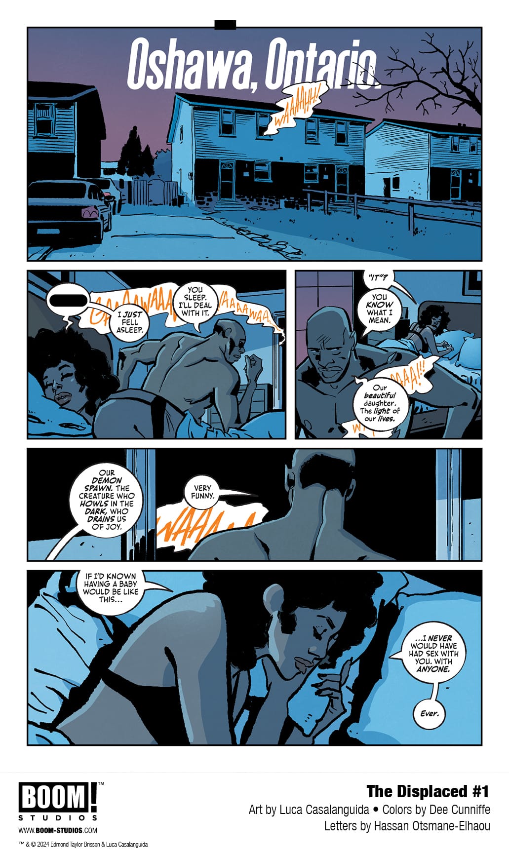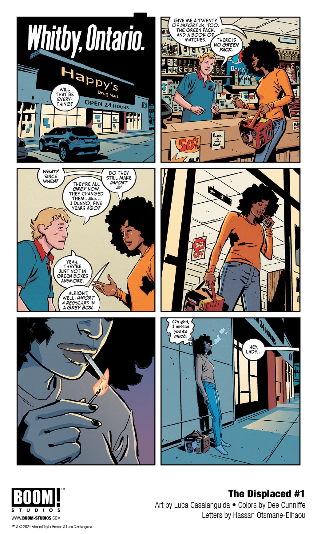 Part of the charm for The Displaced #1 is that it’s a build through the issue. The event that “destroys” Oshawa happens rather quickly, but it comes off more as disaster than some sci-fi mystery. It’s the teasing that happens after, the slow build, that really makes the comic stand out. Brisson has nailed the center of the crossover of sci-fi, horror, and mystery.