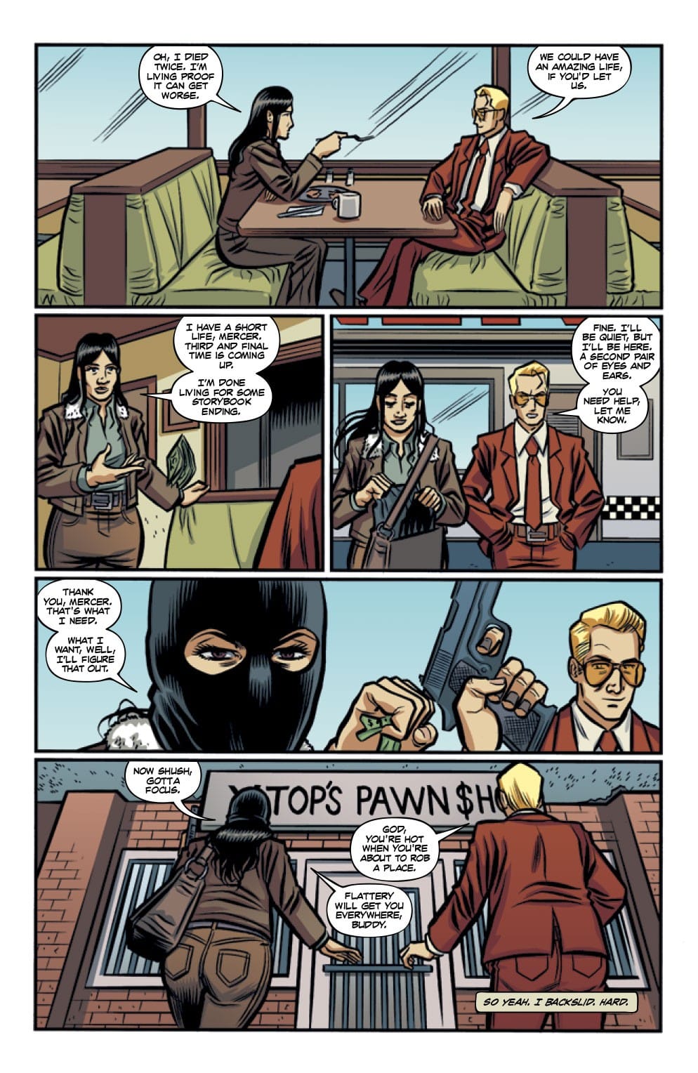 But, what’s also impressive is how Sebela slowly brings us into Callie’s world. At first Callie is very relatable. She has a horrible job. She’s generally used and/or ignored. She’s a down on her luck individual. She then slowly turns into a robber with a heart (joke intended). By committing her crimes, she also uses the gains to help individuals in a Robin Hood sort of way. By Sebela doing this, he continues to keep Callie on the side of the “angels” in a way as she robs folks worse than her. It’s a concept that’s been done a ton, but it helps keep Callie as someone we cheer for.