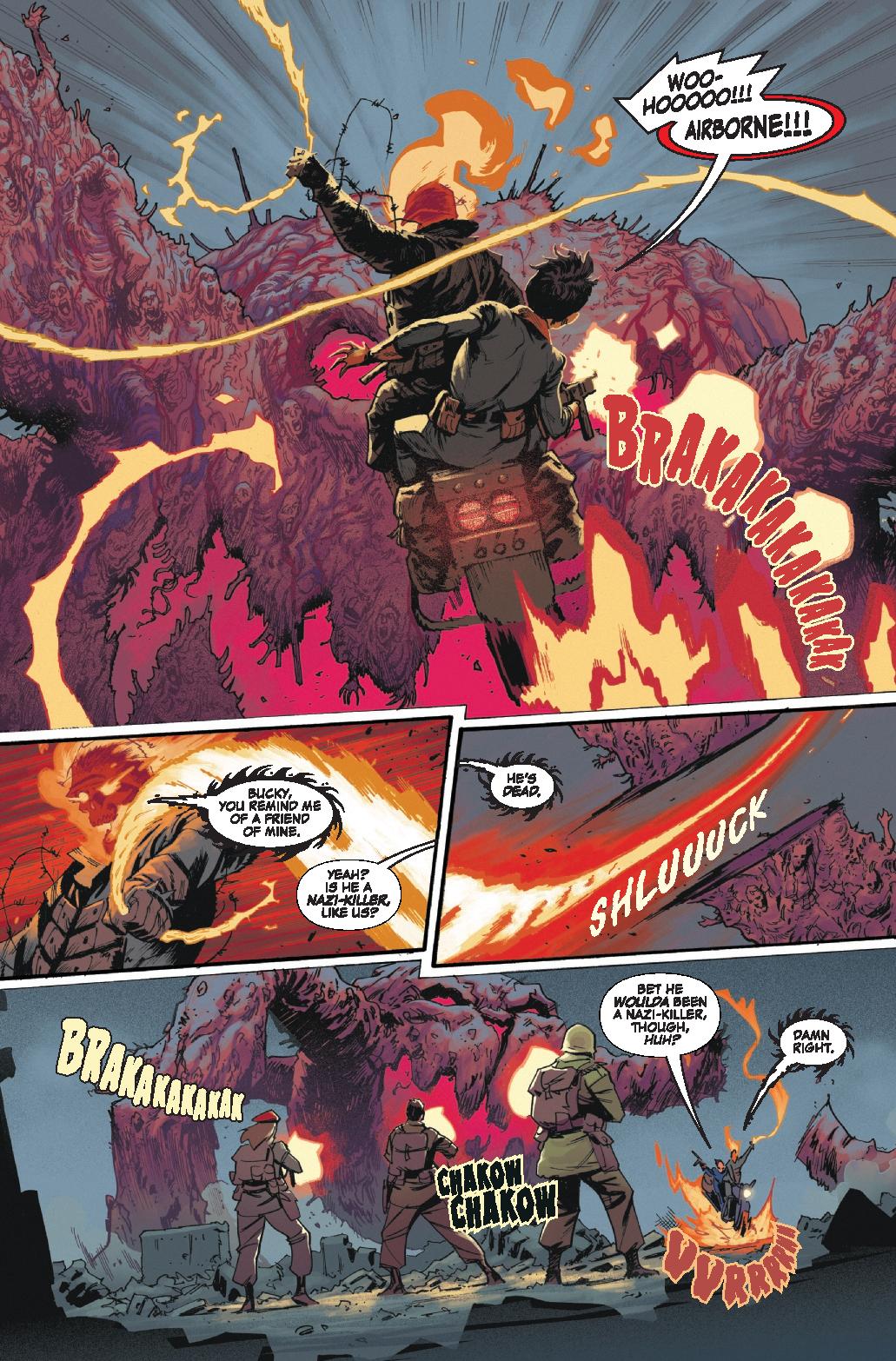 Written by Phillip Kennedy Johnson, Hellhunters #1 does a solid job in introducing its hero and villains and infusing the horror genre with war comics. It’s very much an introduction quickly taking us through the two origins both of which don’t have much in depth but really, it’s not needed. The Nazis make a deal with a devil and a dying soldier makes a deal to come back as Ghost Rider. Beyond that, that’s all we really need to know. The two sequences that lead to each of those moments are solid and in some way hit some cliches but still are more than entertaining in a pop sense.