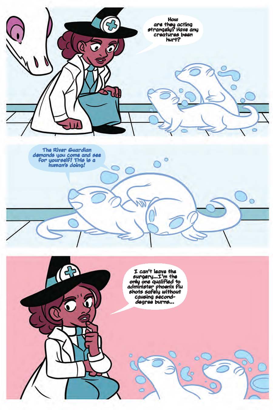Meanwhile, a mysterious magic in the water makes river creatures, both magical and normal, behave in odd ways. Beavers build elaborate wood houses teetering on the edge of collapse, kelpies cast aside their magical disguises when trying lure people to the water, and ice swans make ear-piercing mating calls and freeze chunks of water solid-all similar to the creature at the clinic.