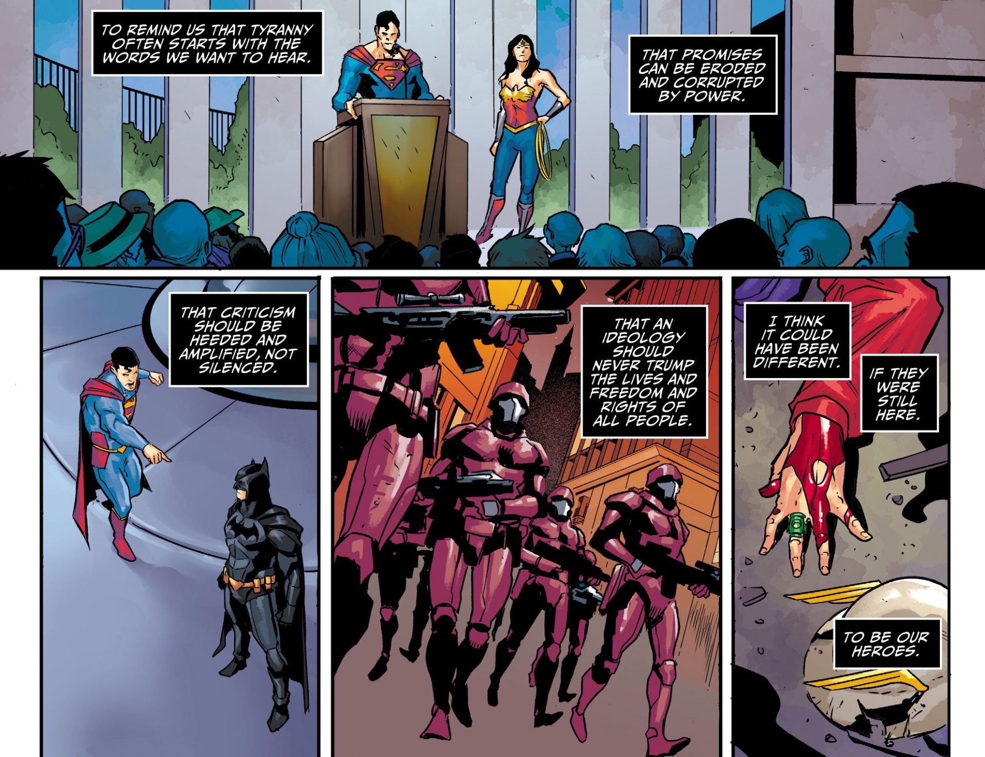 Tom Taylor delivers a new chapter in the story that’s a parable about power and fascism. In this prequel to the popular Injustice comics and video games, the story clearly has a stance on the fact that fascism is bad. It’s a subtle mirror to our current politics with a line drawn as to which side it falls on when it comes to fascism.