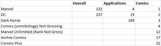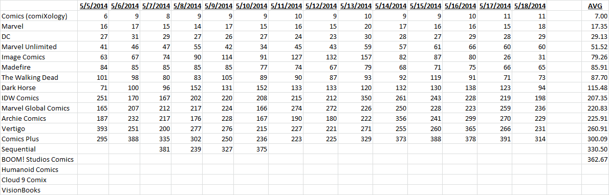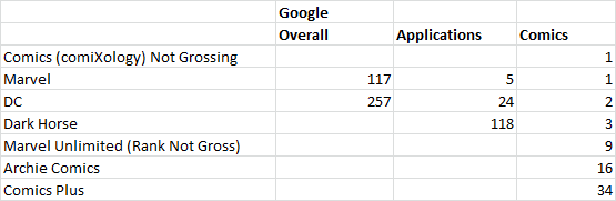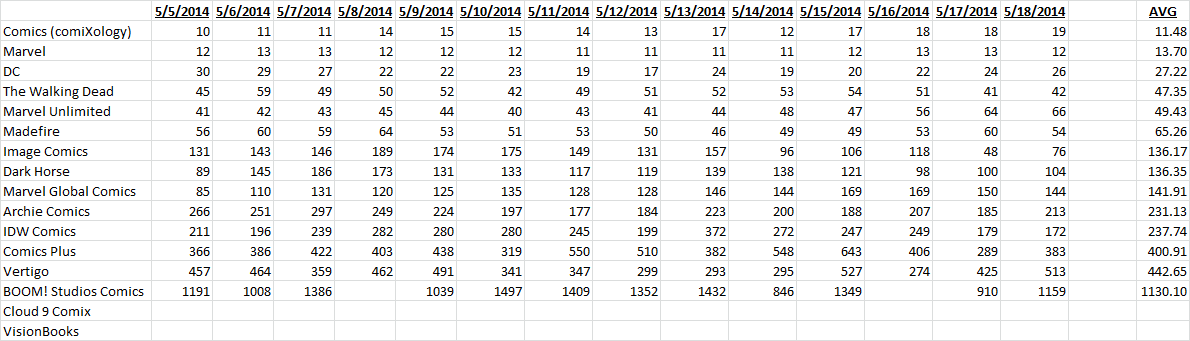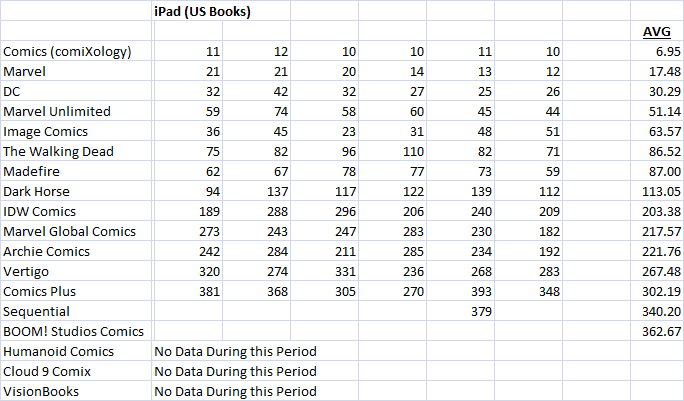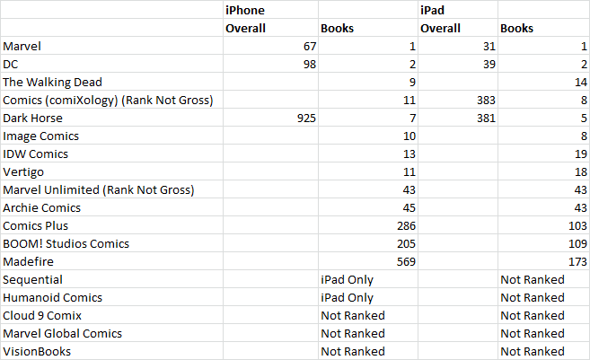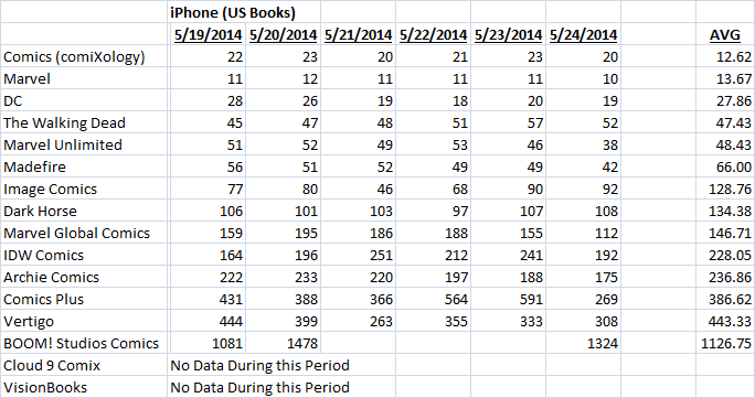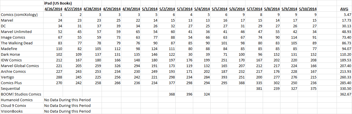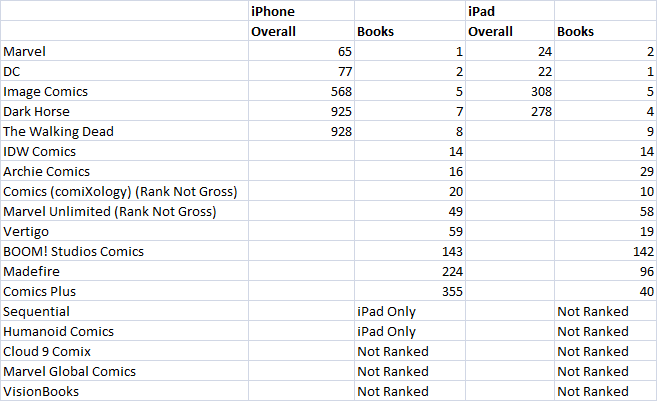 I’ve also included a second ranking by day of downloads on iOS. If there’s massive issues with comiXology’s plan, we’ll see it’s download rank drop over time, we don’t see that this past week, but individuals were forced to update the app, so those numbers could be skewed a bit. We’ll see how it plays out.