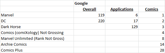 What we do know is the Google rank has not been impacted much in ranking, if at all. The app is still number 1 for comics, and it only slipped a little for all apps and the overall ranking.