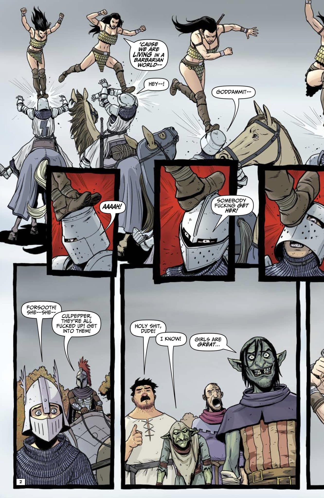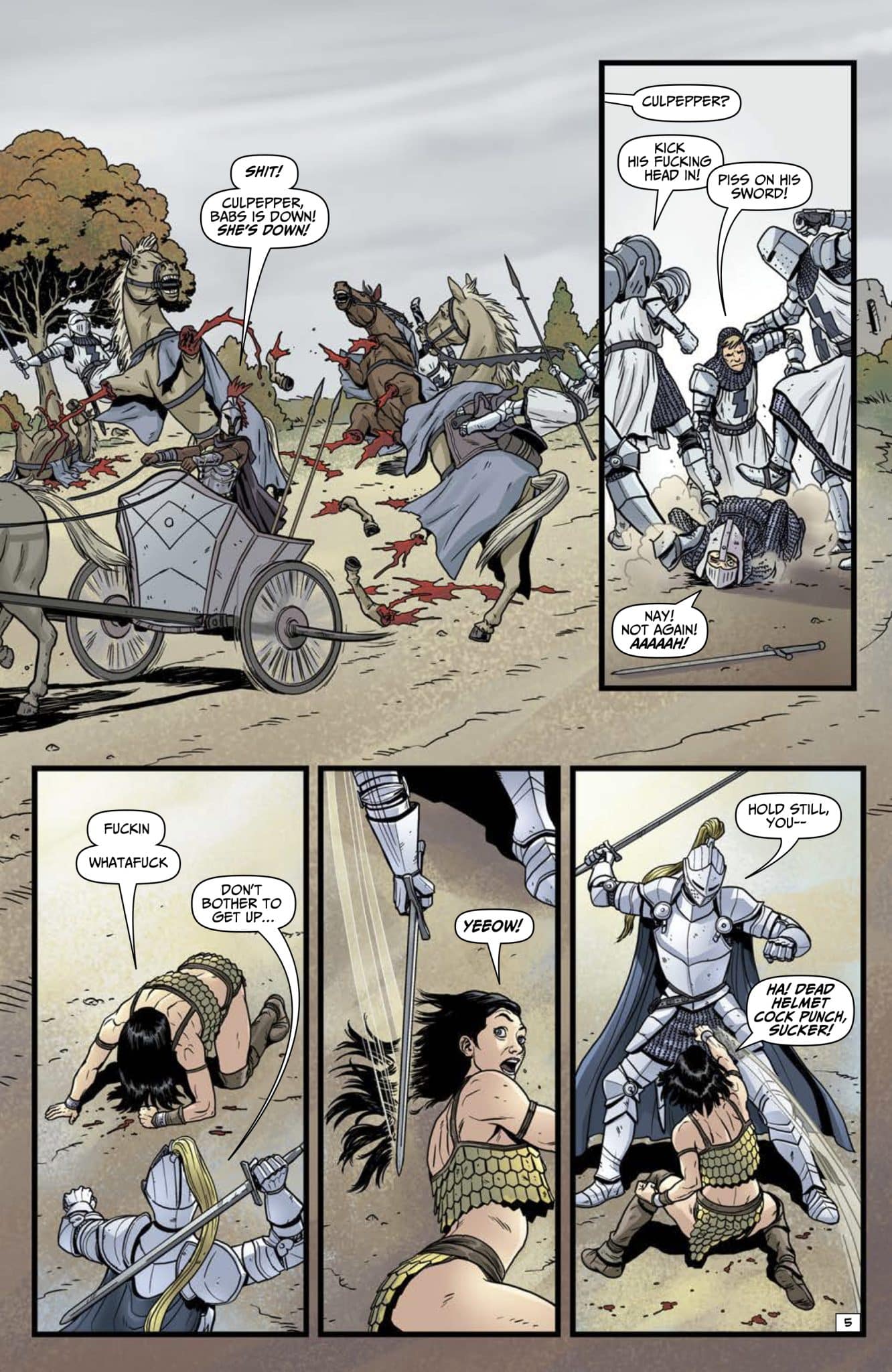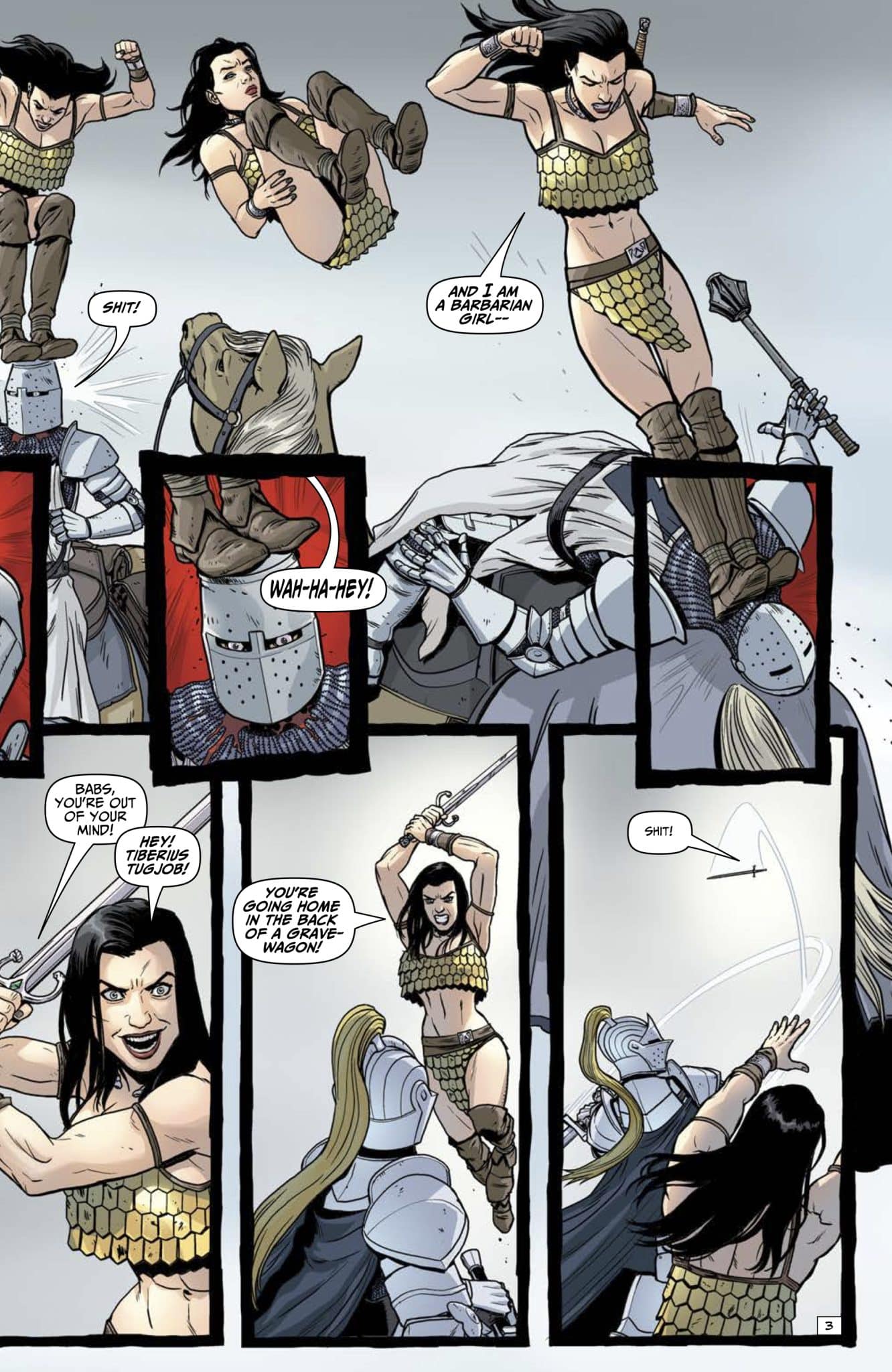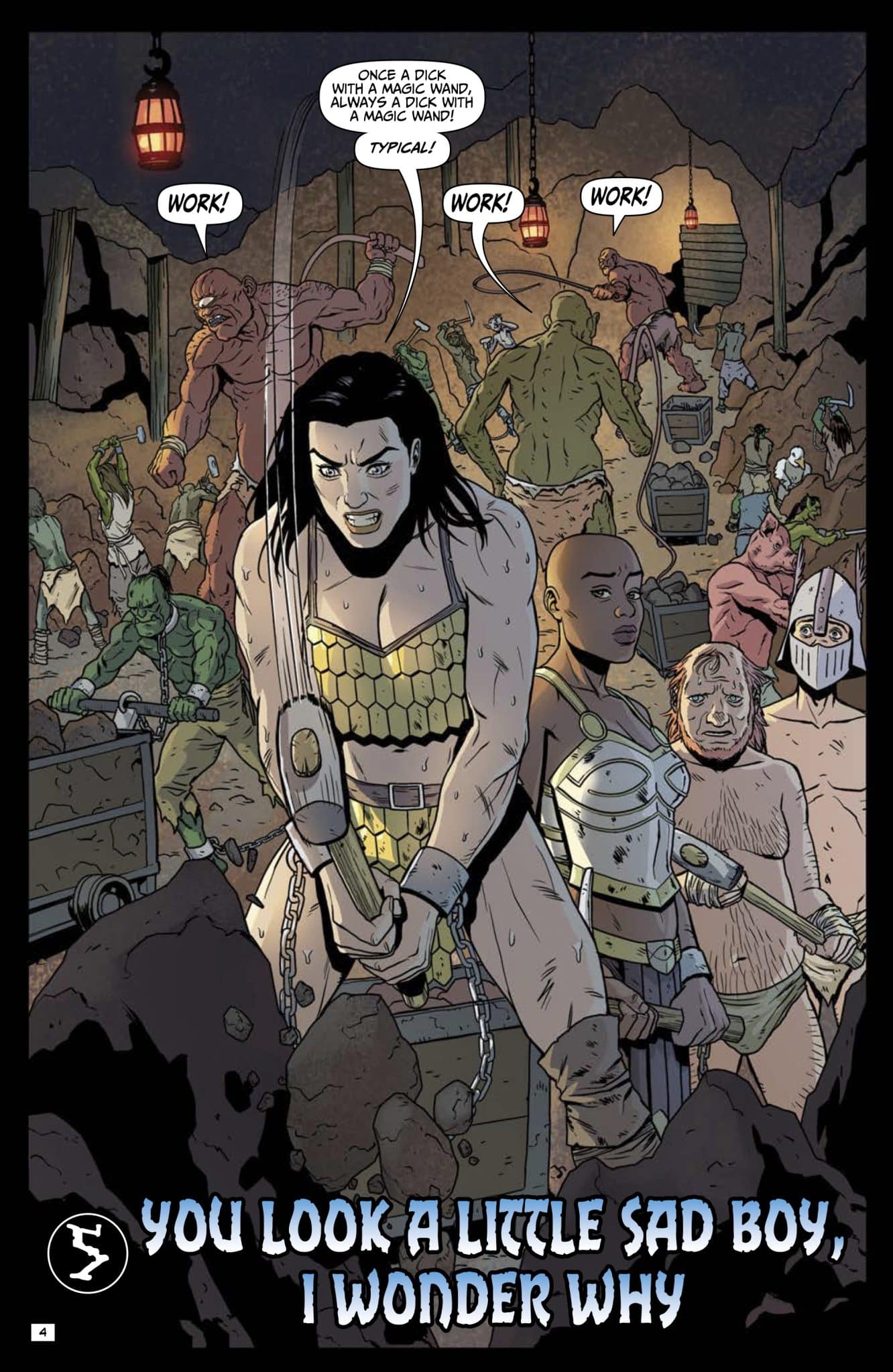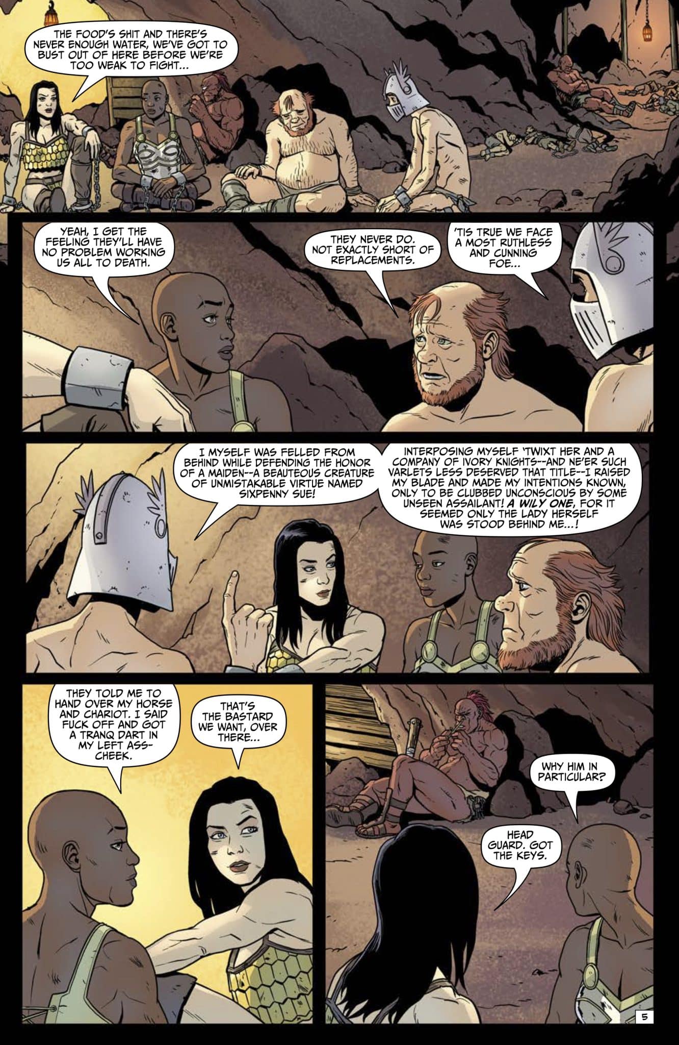 More sword-and-social-satire action from the acclaimed Ennis/Burrows team! In the depths of Tiberius Toledo’s diamond mine, Babs and her allies toil in captivity, until an escape plan forms—involving the libidinous Head Guard and a shocking sacrifice of virtue!