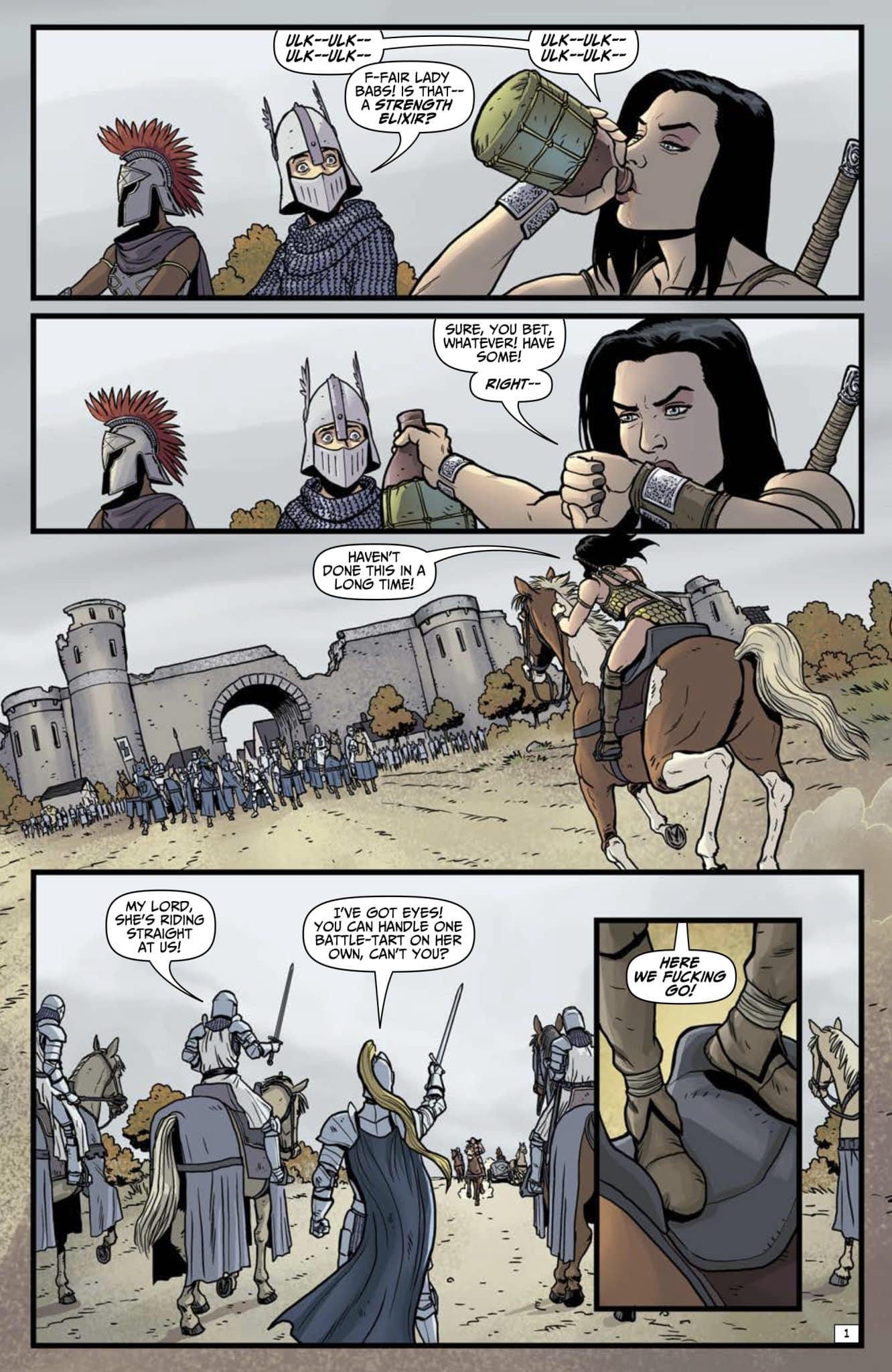 The hit Ennis/Burrows sword-and-sorcery satire returns! A day of over-the-top carnage in a gladiator arena leads Babs and her partner-in-barbarism Izzy directly into a strange, unfamiliar, bizarre situation: they actually have money! That’s good, right? Wrong—because it’s about to lead them down a dark, horrific road to the devastated wasteland of Mordynn.