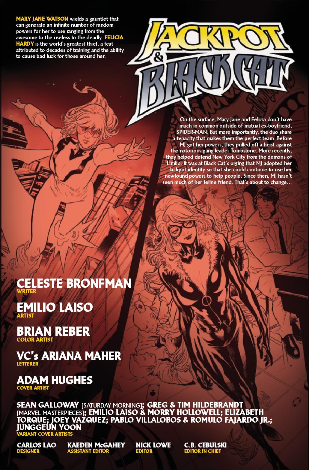 LUCK BE THE LADIES! When someone blackmails Black Cat into a public and blatant crime spree, Jackpot comes to her aid! What classic Spider-Villain is behind the blackmail?! Someone with history with at least one of our titular heroines!