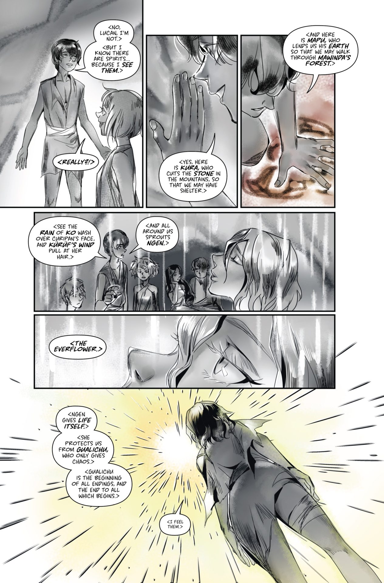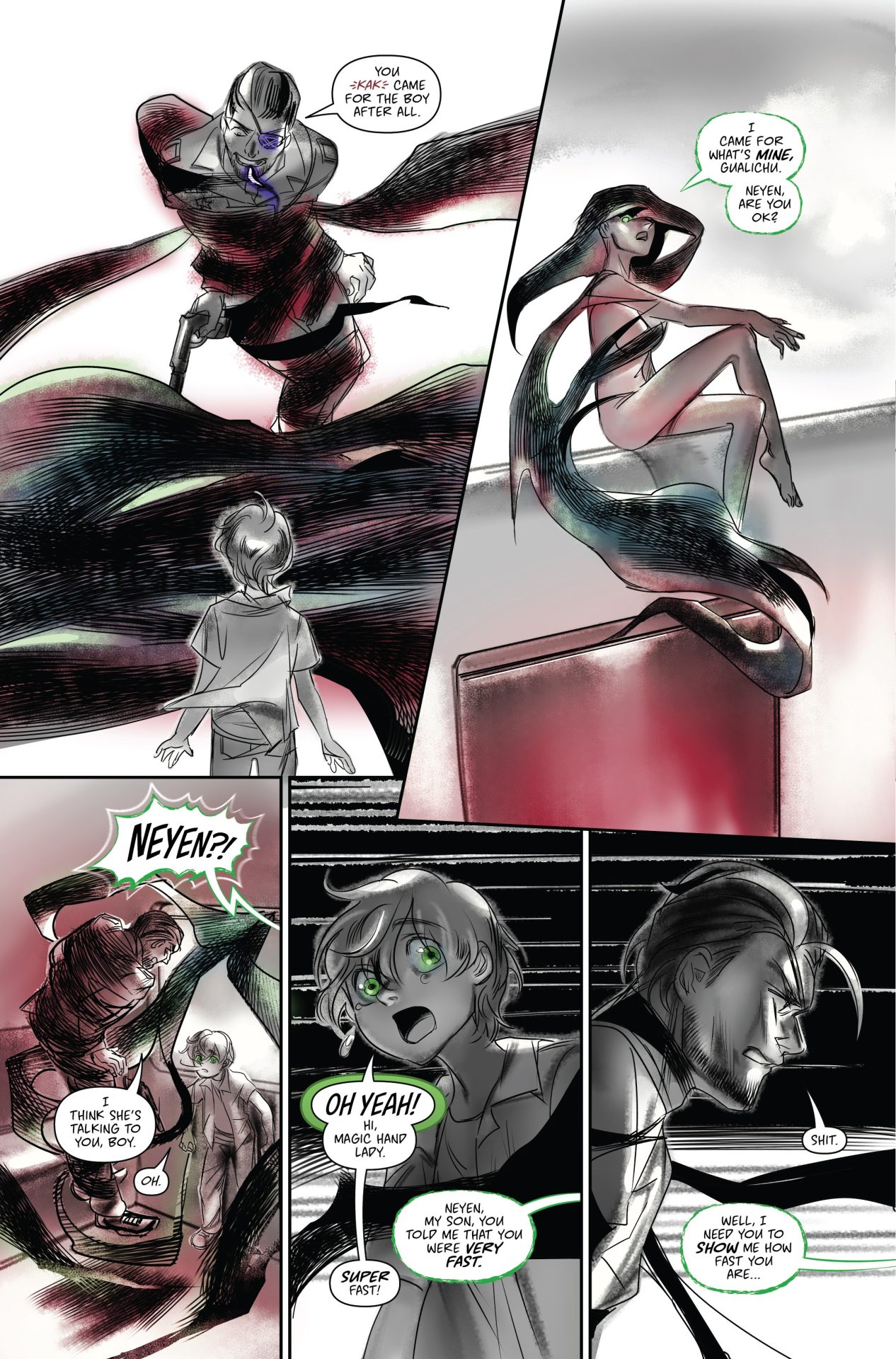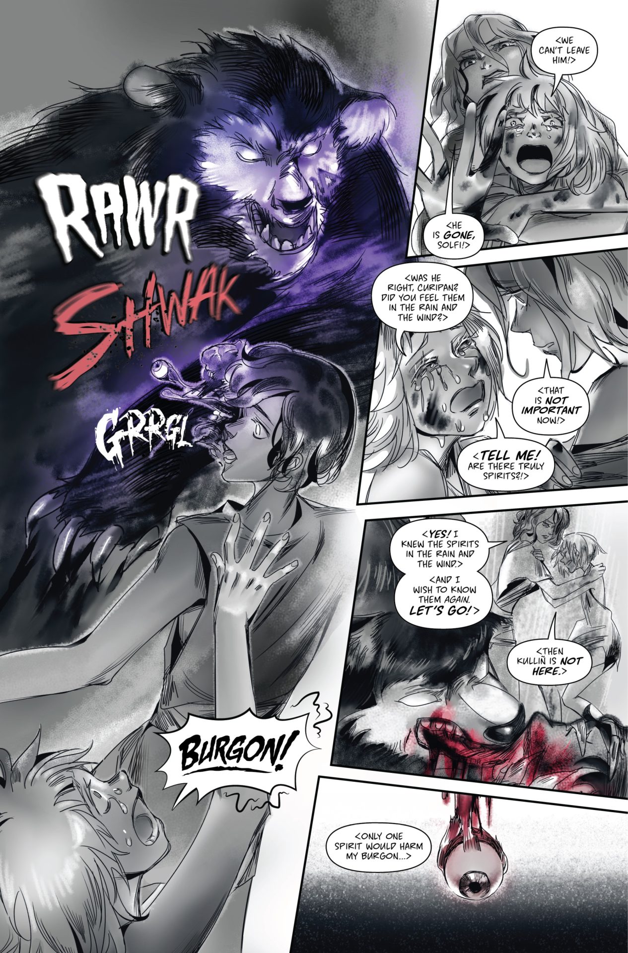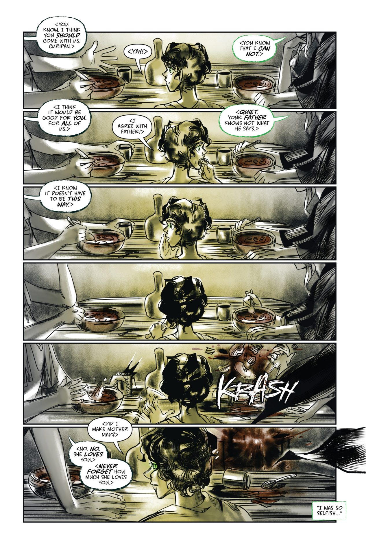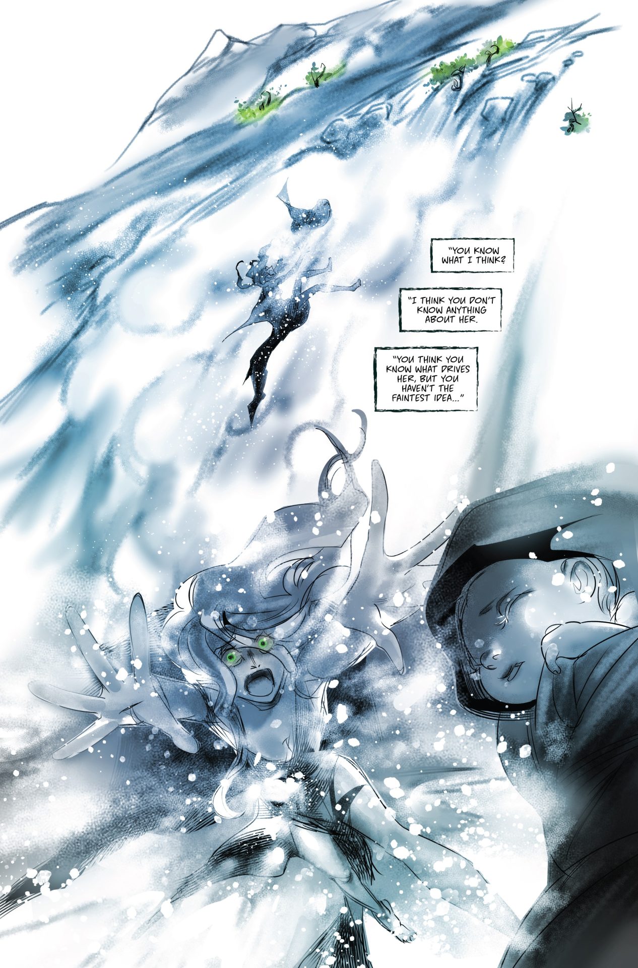 Alice Li Barnes‘ art is really interesting. There’s a manga influence to it with an almost ethereal quality about it. Mainly in black and white, the debut issue uses color very sparingly to emphasize certain aspects of the storytelling. There’s some fantastic page layouts in the issue changing things up from the standard squares and rectangles. Instead we get the flow of a cloak running through the panels of a page, lots of angles on panels to dramatize the moment, and overall a visually interesting layout to pages. There’s a lot packed in at times but it works.