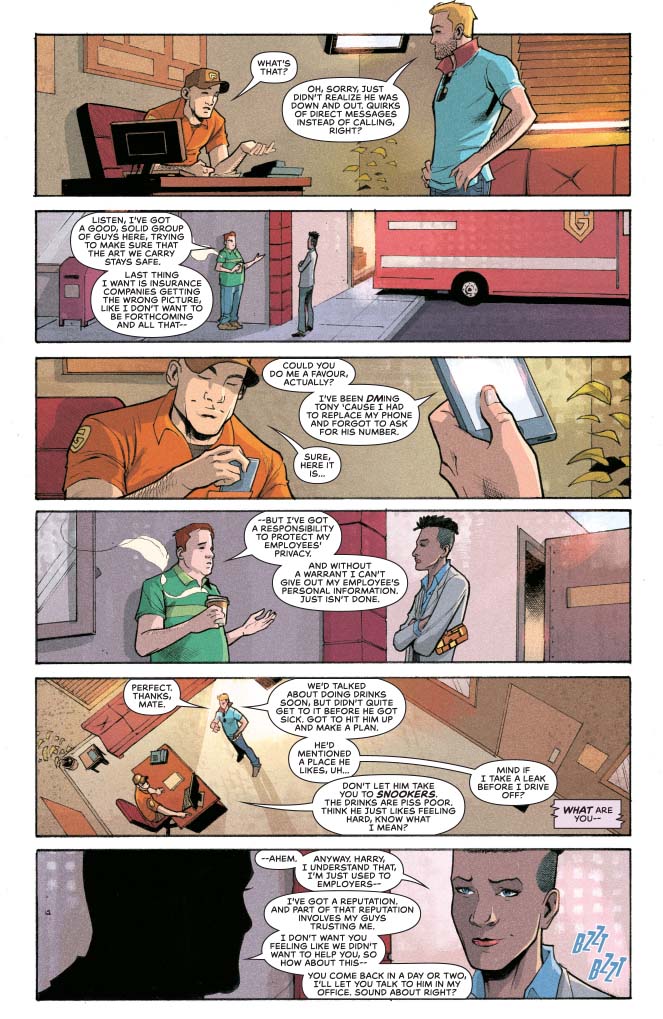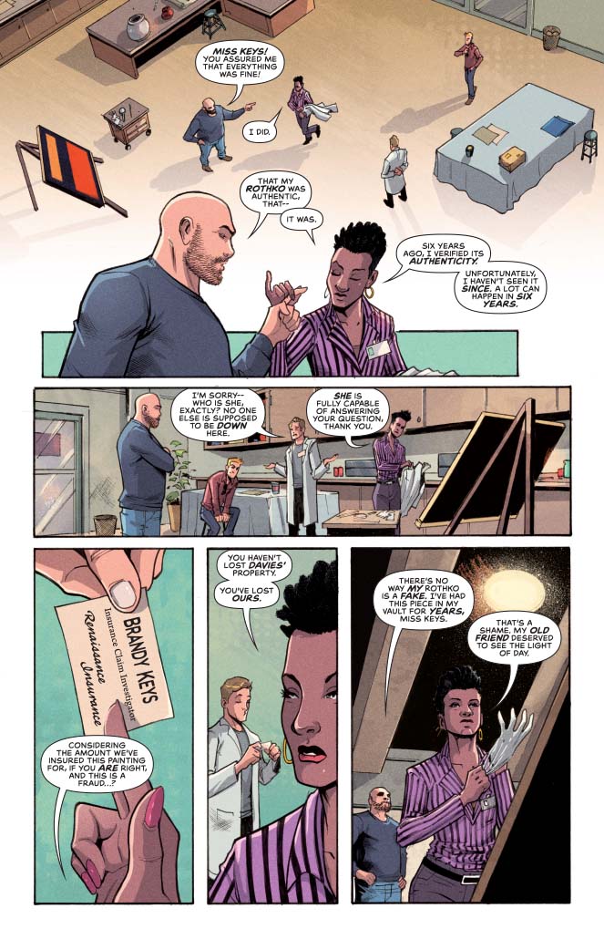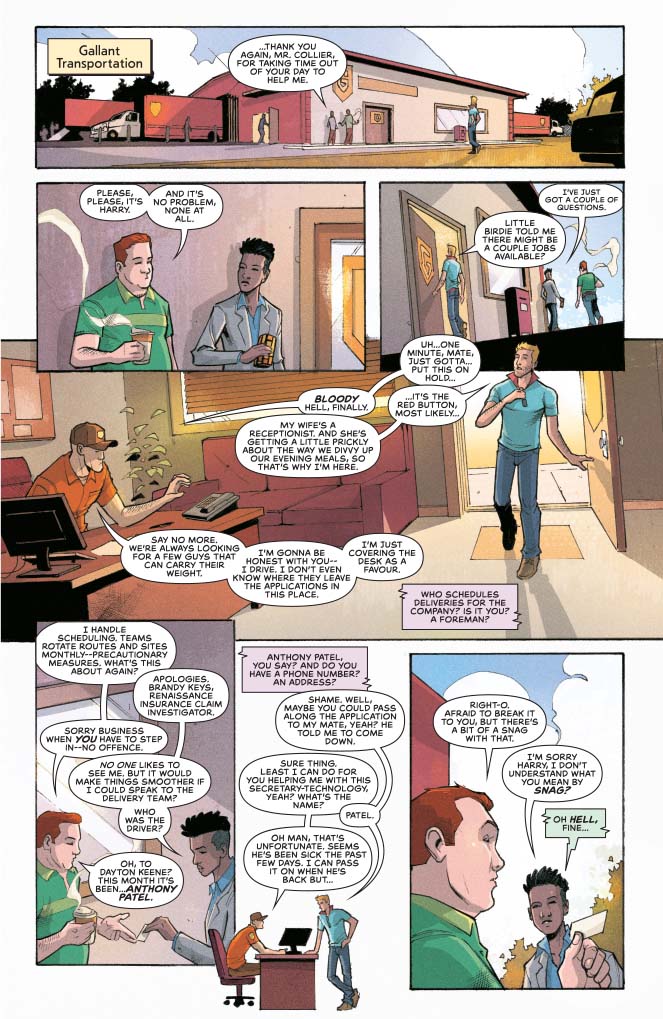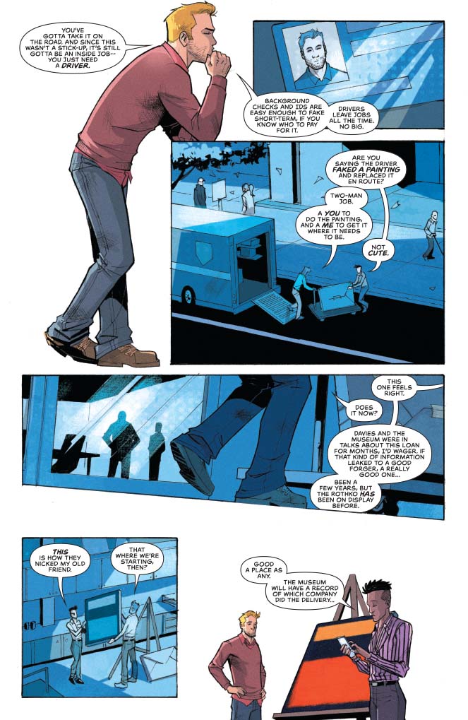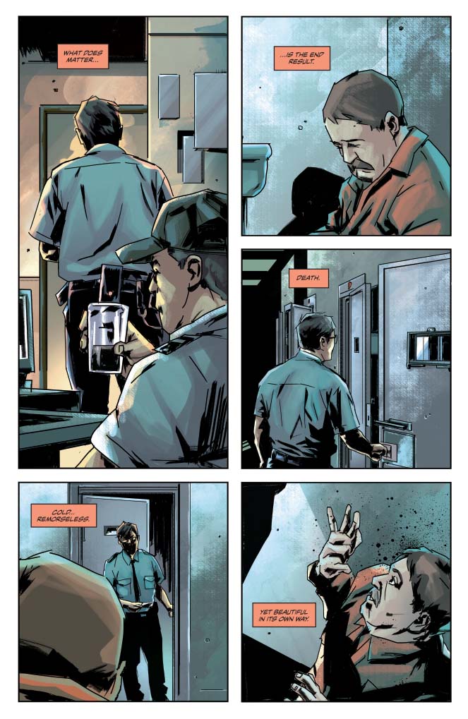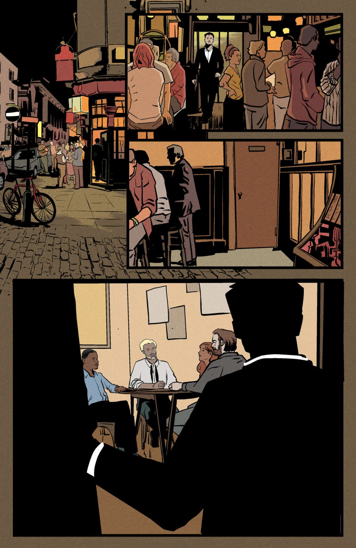 Marco Finnegan‘s art is excellent. With color by Dearbhla Kell and lettering by Jeff Eckleberry the comic keeps a look that has been consistent for some time when it comes to the comics. There’s a minimal amount of colors and detail in the background. We’re given what we need to be given when it comes to the visuals. The comic feels a bit more like a noir/detective story that way making a rather intriguing mix of style and story that works so well.