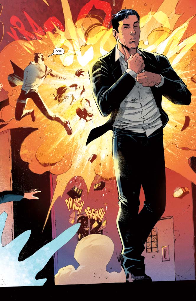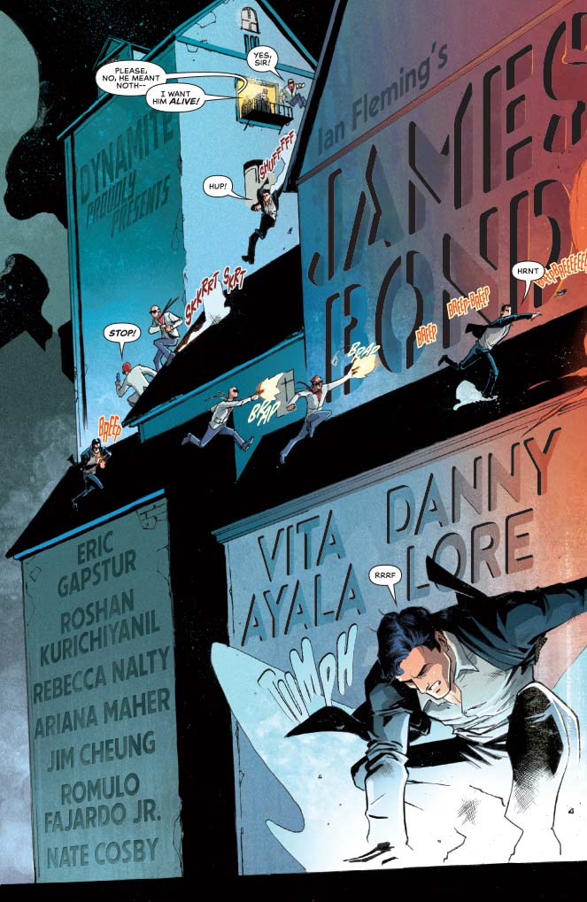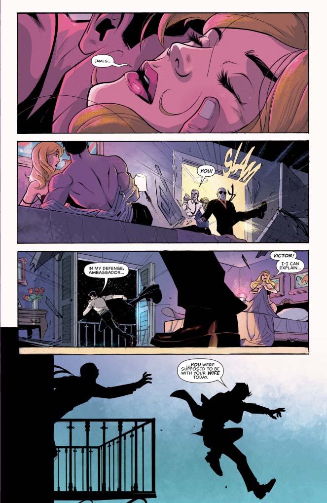 Written by Phillip Kennedy Johnson, 007 #1 kicks off with excitement. It feels like a tradition at this point to open a Bond adventure this way. That opening also plays into the story to come as it sets up a mysterious villain and hints at the trouble ahead.