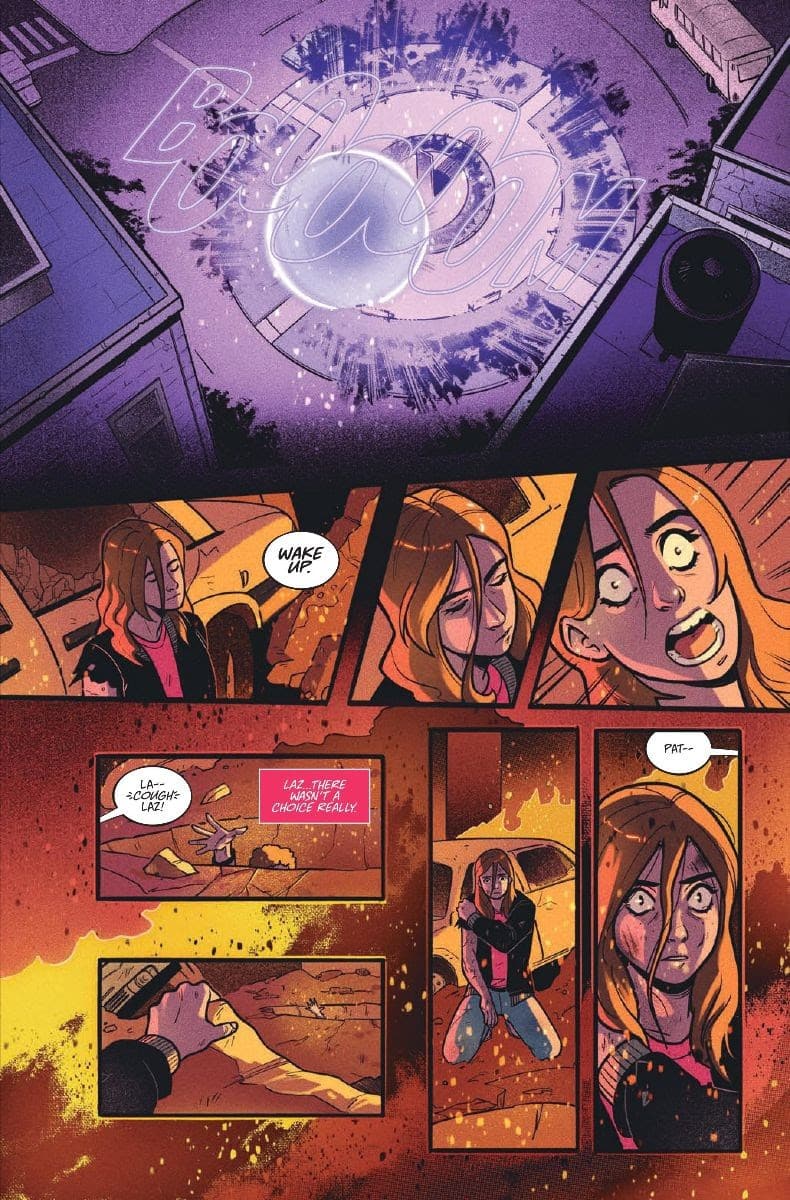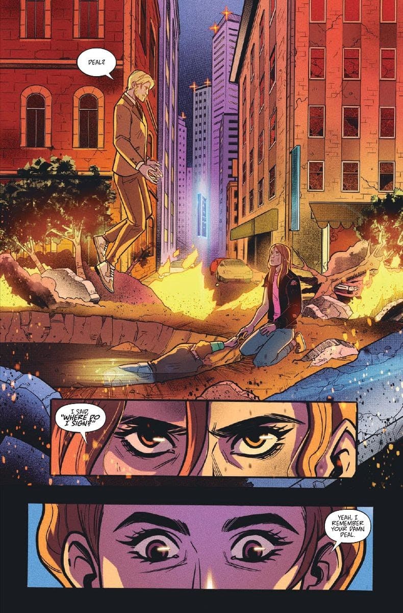 Don Handfield and James Haick imbue these pretty one dimensional high school movie stereotype with an awareness of class and race in The Mall #1 and then add the mob elements. Unlike the Free Comic Book Day issue, Handfield and Haick almost immediately throw Diego, Lena, and Dallas into a world of guns and rivalries as Lenny is threatened by a homophobic member of another rival gang. In some of Handfield and Haick’s harshest writing, he basically uses Reagan era AIDS rhetoric against his opponent, but before the teens can settle into setting up their mall stores, they are drawn into a fire fight. Loureiro’s panels tilt, his art is more stylized, and Dijjo Lima’s color palette is more intense to show the brave new world that these teens are in. This isn’t an after school job or scholarship program; this is war.