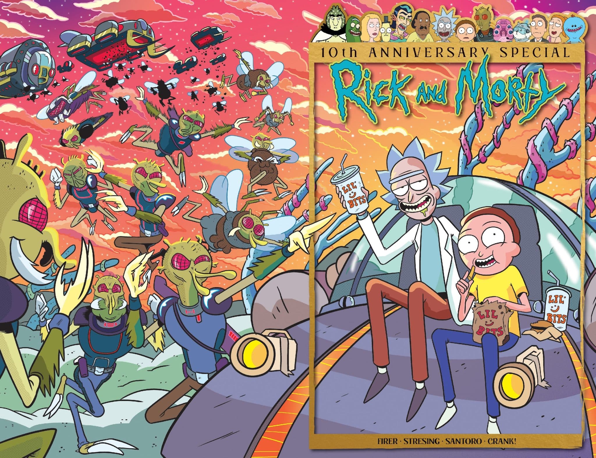 The acclaimed creative team behind Rick and Morty: The Space Shake Saga – writer Alex Firer and artist Fred C. Stresing – run an endless gauntlet of enemies, lovers, and completely inconsequential side characters from all 10 years of Rick and Morty—for new and old fans alike! Don’t miss the all-out rager in honor of the duo of the decade when the Rick and Morty: 10th Anniversary Special #1 unleashes 64 pages of awesomeness on July 10th – featuring a wraparound standard cover by Marc Ellerby, alongside variant covers from James Lloyd, Suzi Blake, and Fred C. Stresing.