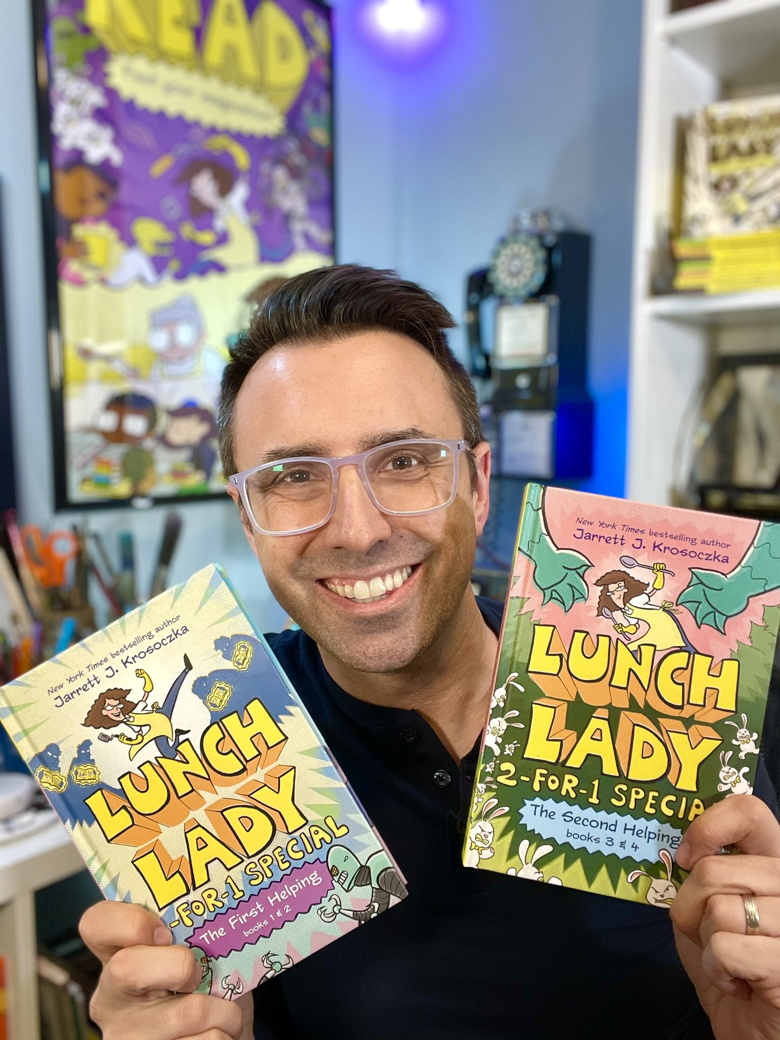 The first four books in the popular graphic novel series Lunch Lady by award-winning author Jarrett J. Krosoczka were just reissued for the first time as hardcover, full-color two-books-in-one editions: The First Helping (Lunch Lady 1 and 2) and The Second Helping (Lunch Lady 3 and 4). The graphic novels are a bright and hilarious series about a crime-fighting lunch lady.