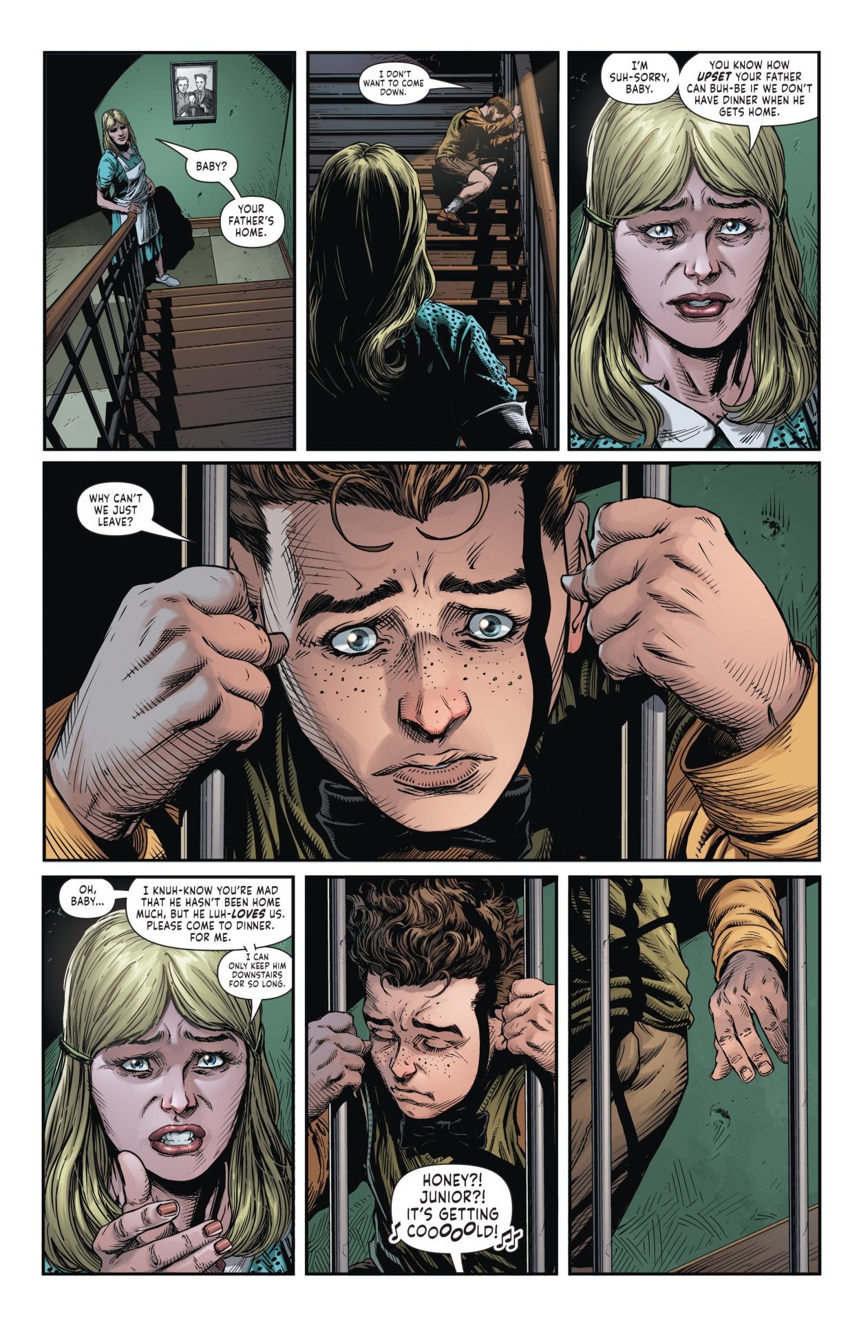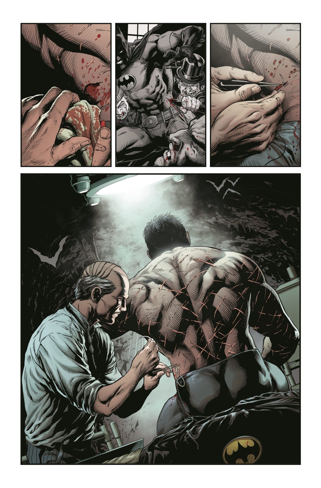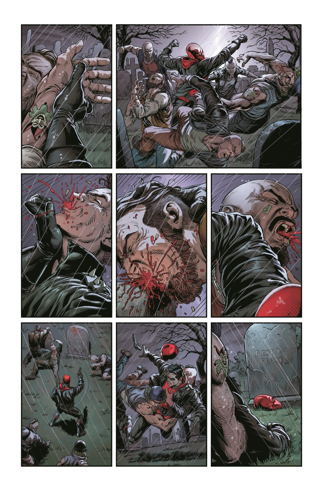 Part of the emotional oddness of the comic is that it’s very much a “horror” comic. Jason Fabok‘s art, with color by Brad Anderson, is one of nightmares. Continuing a modern-Watchmen like riff in the style, the comic features the hunt for the two Jokers and a discover of failed conversions with a suffocating like attack. Add in yet more torture of Jason Todd and it’s a comic that’s just not very uplifting. The colors look beautiful but are dark with a sickly tint to everything. Batman isn’t necessarily known for a cheery style but this feels a bit gloomy even for that line of comics. Rob Leigh‘s lettering stands out especially as the lettering navigates the Joker’s moods. The lettering is what really drives those moments.