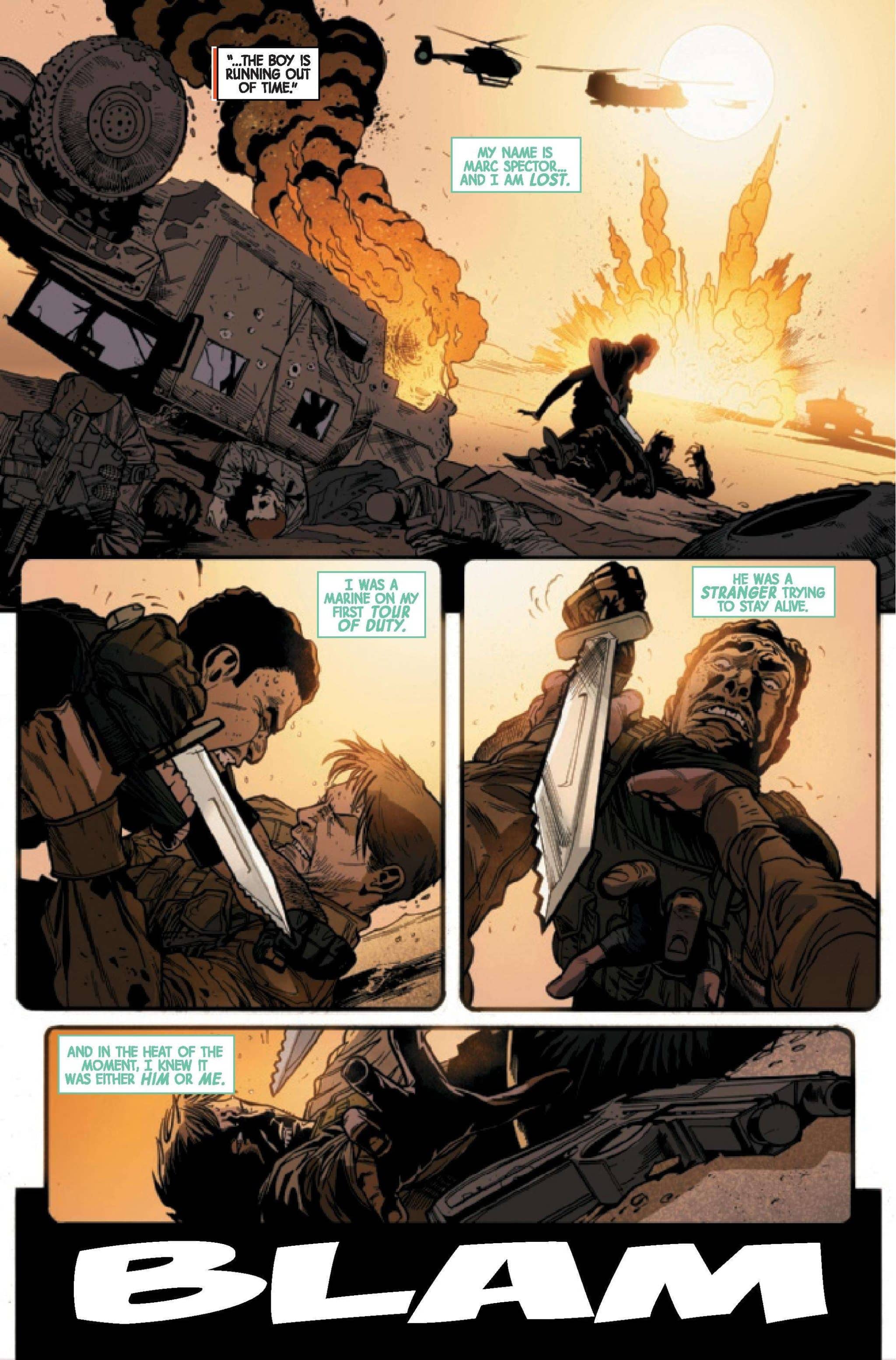 A trio of artists handle the different time periods. Ken Lashley provides the art for the present day, Greg Land with inks by Jay Leisten take us to Wolverine’s early days, while Andrea Di Vito handles the Team X segments. They’re joined by Juan Fernandez handling color for the Team X and present day segments while Frank D’Armata handles color for Wolverine’s younger days. Cory Petit is on lettering. While the art styles differ greatly, the switching doesn’t detract from the comic. It works here and helps in some way as the comic moves from one time period to the next. While some art is better than others, overall, it’s good, dynamic, and uses its time and settings well. The overall vibe is one that relies more on Predator‘s action elements than its stalking horror when it comes to its visuals delivering quick hits and sequences.