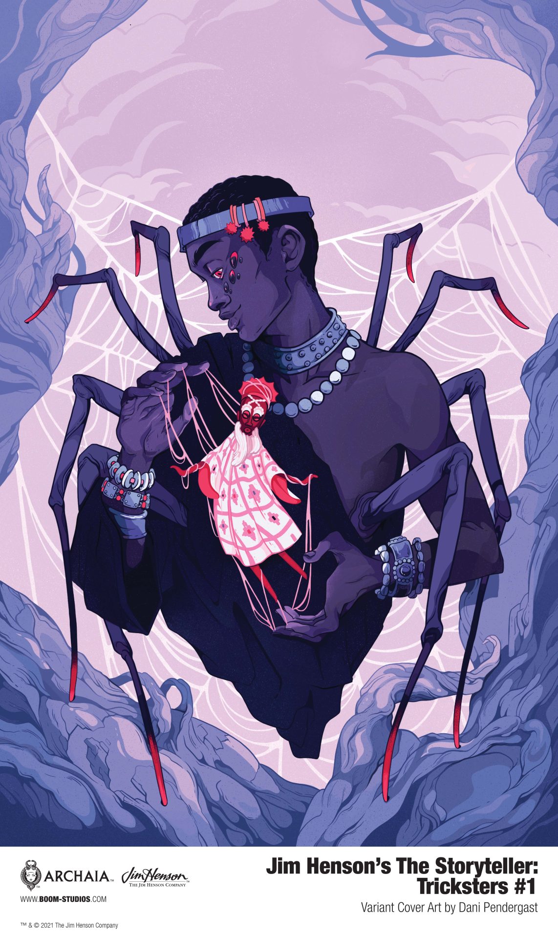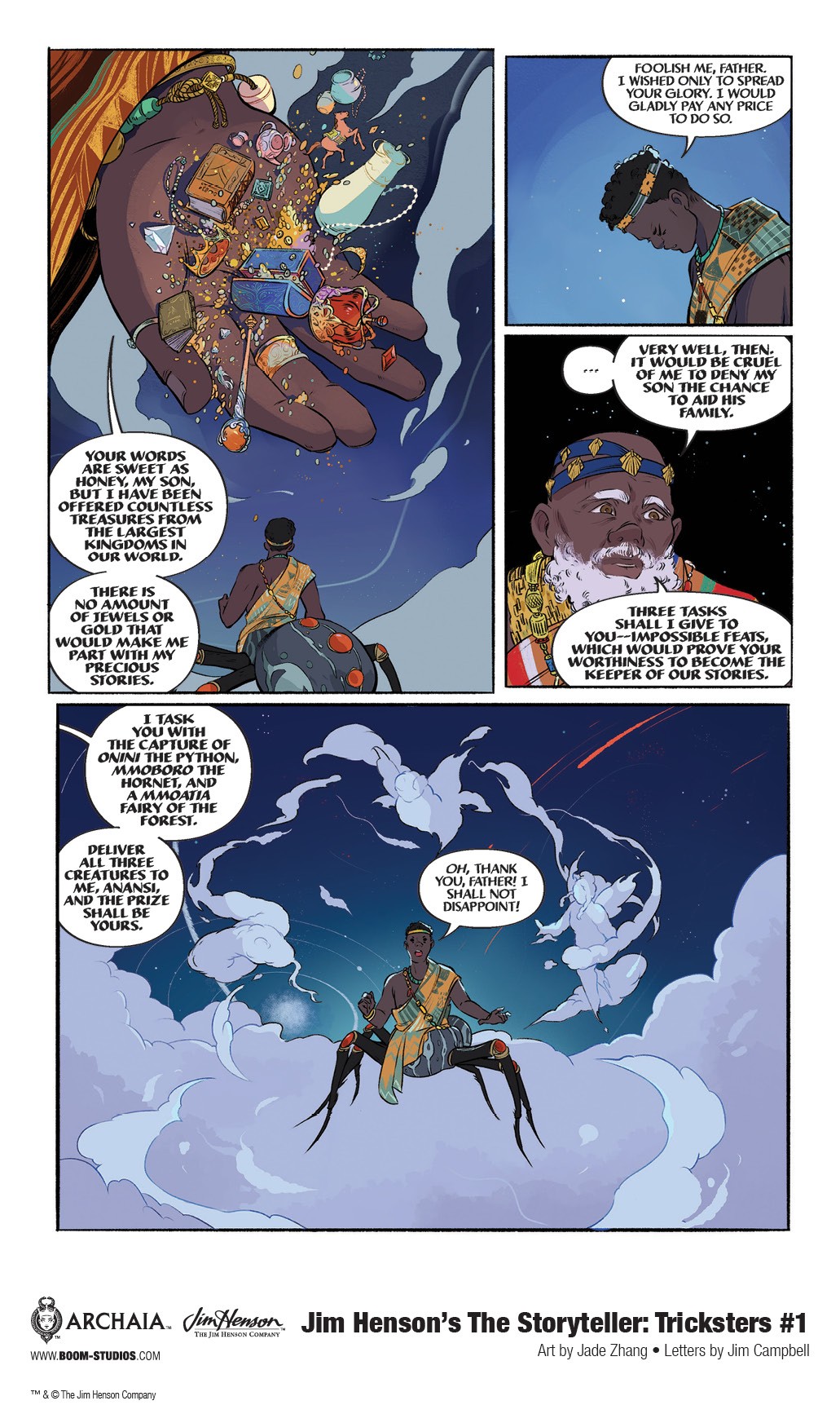 BOOM! Studios has revealed a first look of Jim Henson’s The Storyteller: Tricksters #1, the first issue of a new comic book series based on the Emmy Award-winning classic television show, Jim Henson’s The Storyteller, presenting several extraordinary folk tales of legendary tricksters from the four corners of the world. Each issue will feature a new creative team, with the first issue, by writer Jonathan Rivera, artist Jade Zhang, and letterer Jim Campbell, featuring the most famous trickster of all—Anansi, available on March 17, 2021.