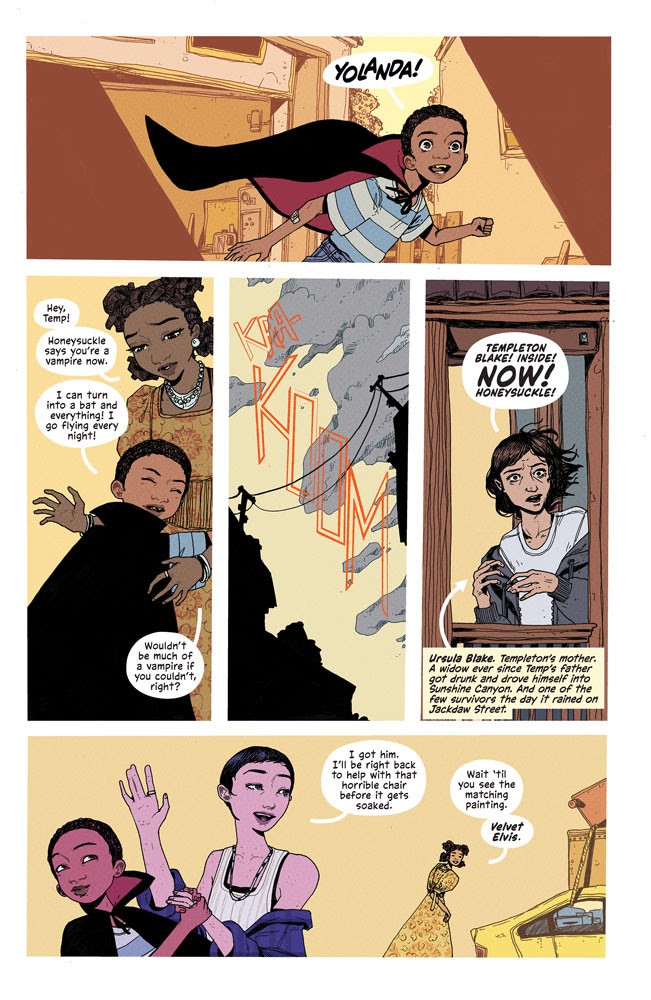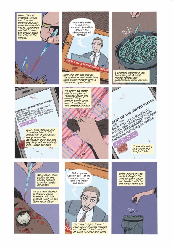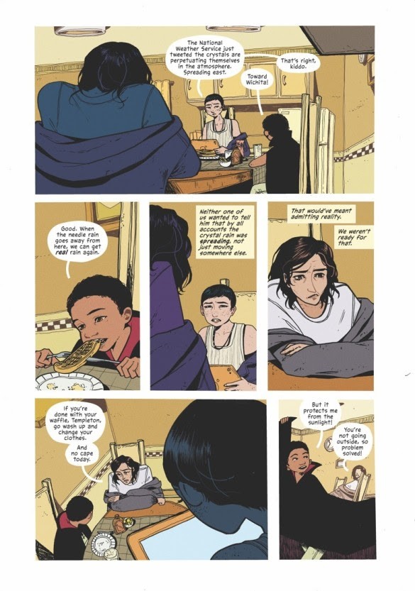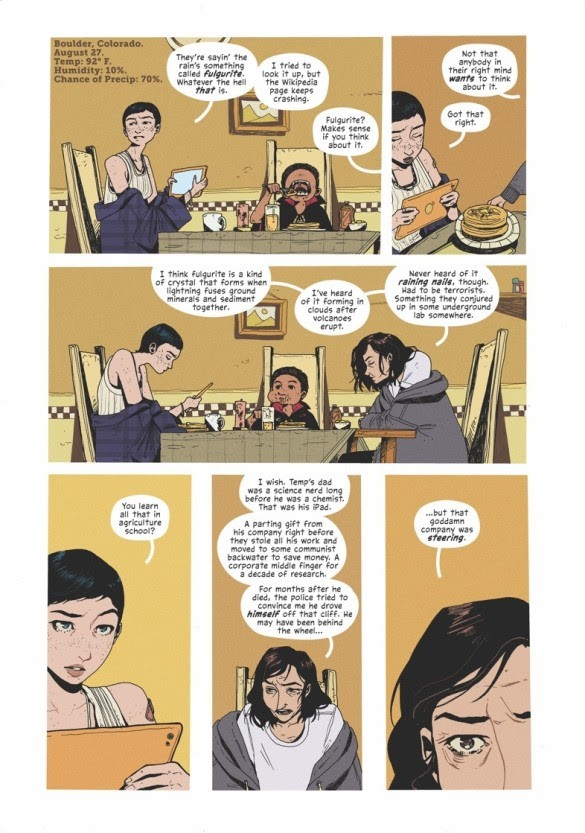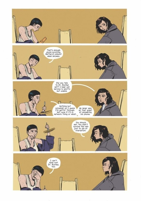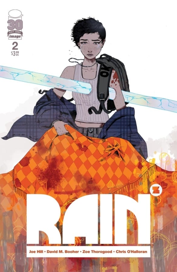 Rain is a post-apocalyptic comic miniseries adapted from one of Joe Hill’s short stories in his 2017 Strange Weather collected and is scripted by David Booher with art by Zoe Thorogood. Though originally written years before the COVID-19 pandemic, it captures some of the feelings of fear, terror, and in some cases, coming together as found family of this time period as protagonist Honeysuckle tries to survive and eventually figure out why crystal nails are raining down from the sky. Rain is part road story, part tragic queer romance and a showcase for Thorogood’s skill at conveying character acting and emotions in life and death situations. Rain is definitely a dark read, but has several great moments where humanity shines even at the end of the world.