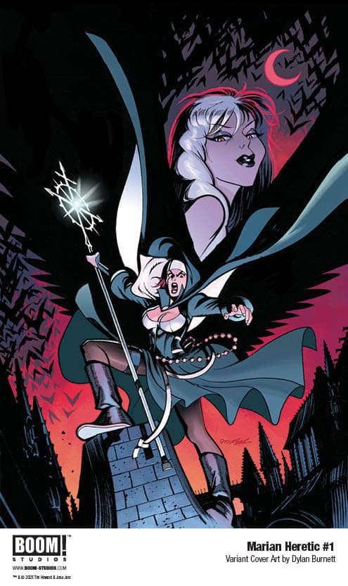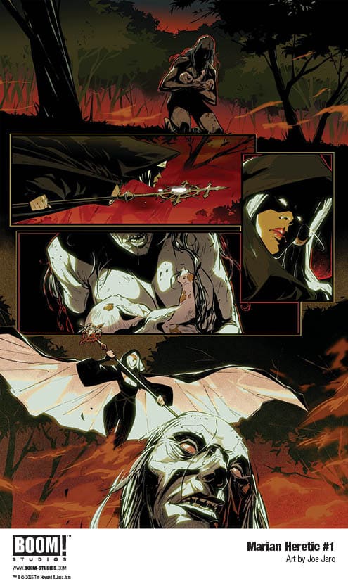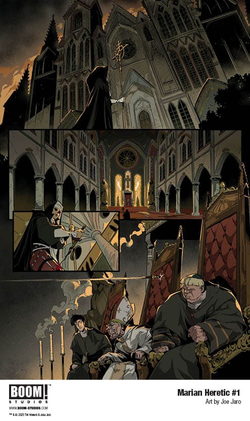 Marian Heretic #1 features main cover art by series artist Joe Jaro, with variants by Dylan Burnett, Jenny Frison, and Suspiria Vilchez. It comes to comic shops October 1, 2025.