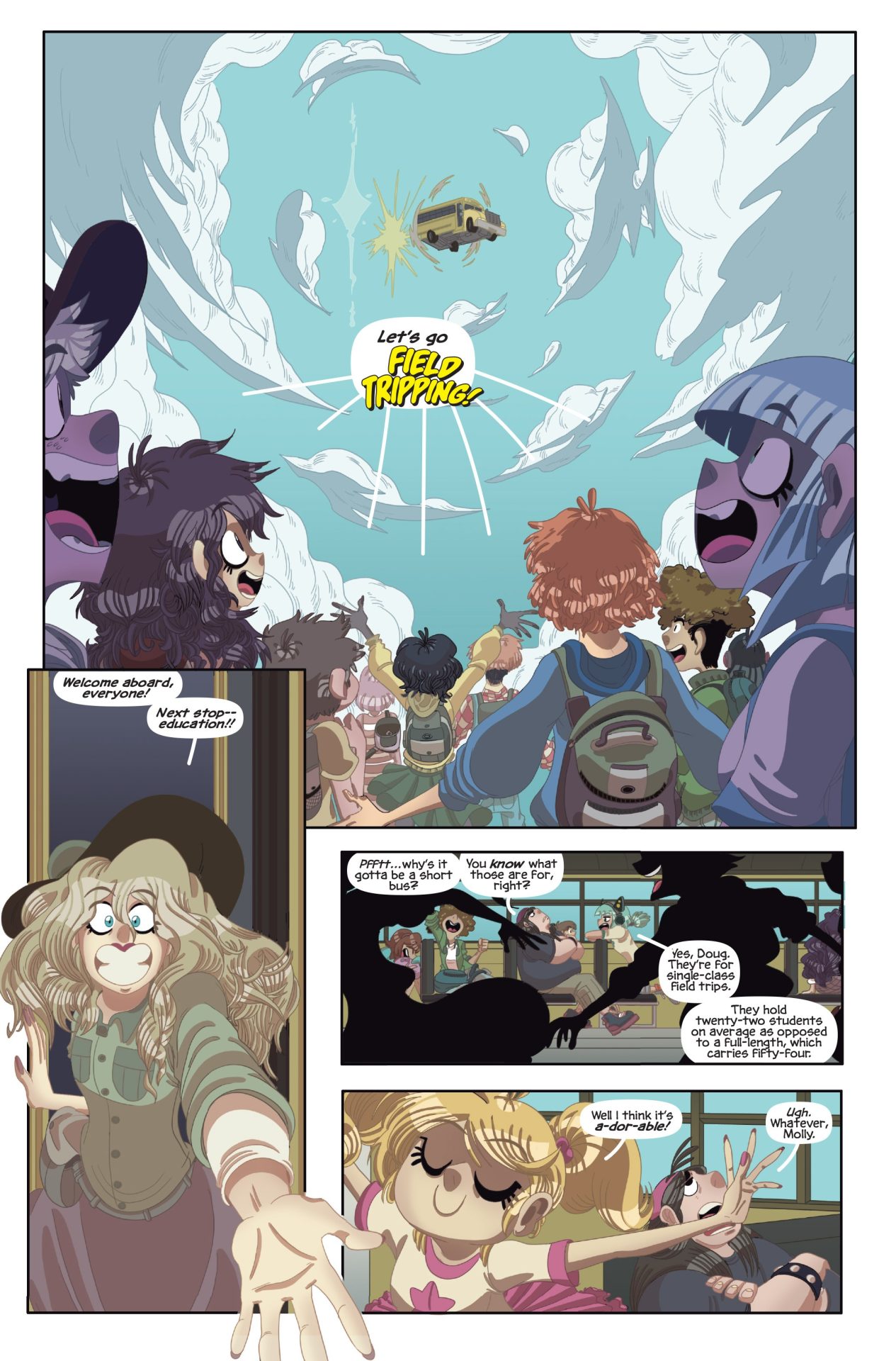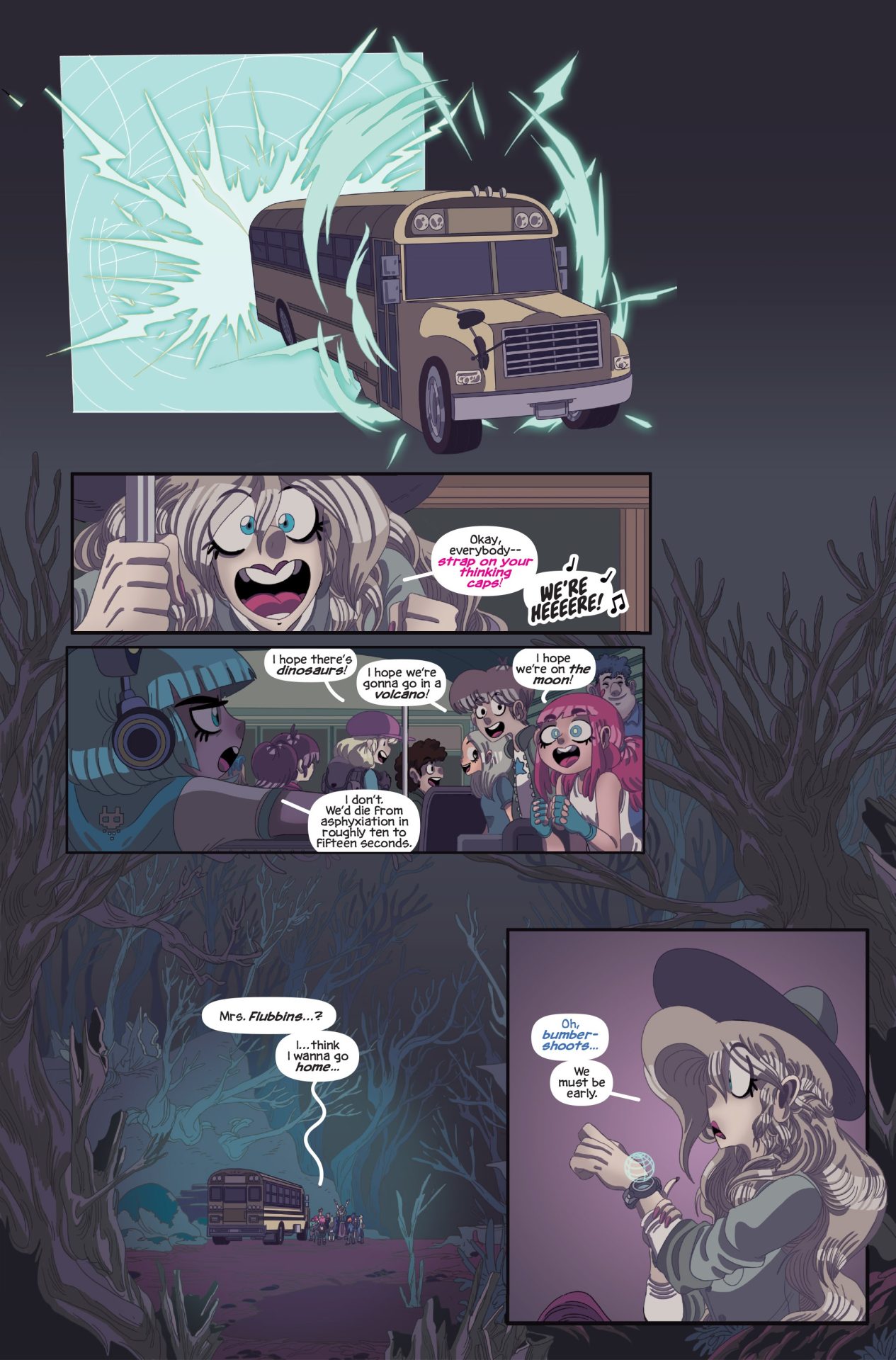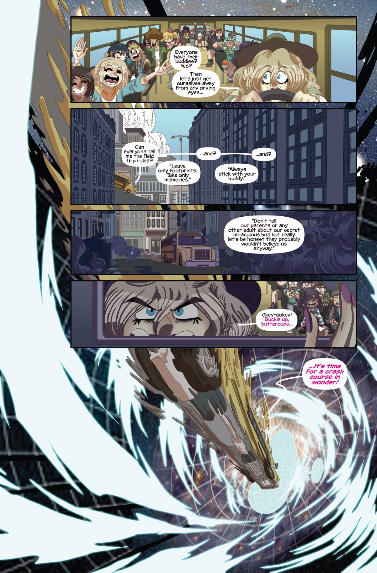 A multiverse-spanning, all-ages story about a flighty teacher with an interdimensional traveling school bus and her students who become stranded – jumping between bizarre worlds but never able to go back to theirs.