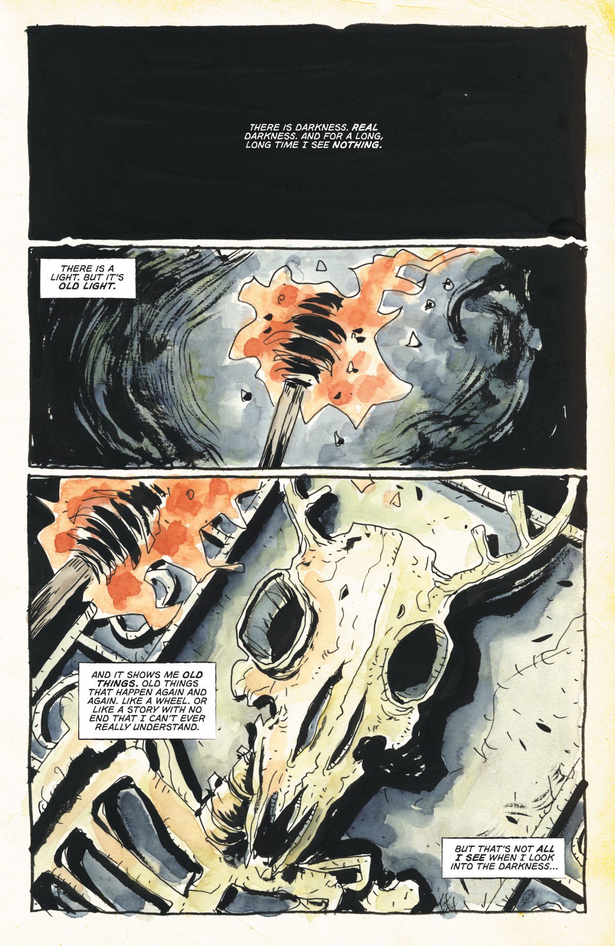 Ridley’s delivery is amazing. There’s a poetic flow to his narrative which forgoes traditional dialogue and instead pages are packed with Pierce’s thoughts. The issue feels more like a novel with amazing visuals than a traditional comic. This is more of a diary confession. Taken through the years we get a sense of how events impact Pierce and his decisions on each step of his journey. There’s good and bad as we see how those decisions both succeed and fail. It’s an honest assessment of the character and we can see his growth and failures as a person. In one comic Ridley gives us a fully fleshed out character full of flaws and an understandable perspective.