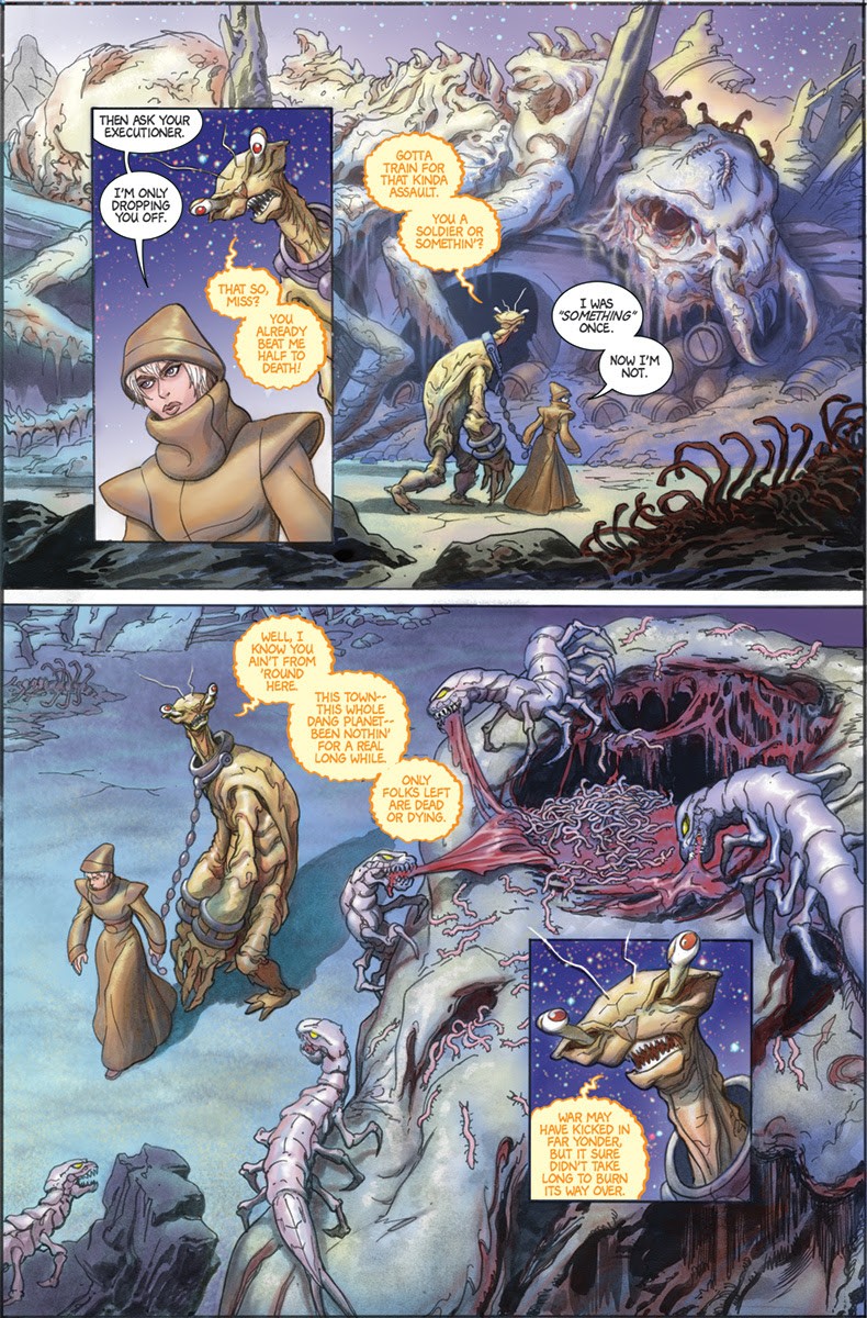 What Keatinge and Clark set up is beyond interesting as the issue continues and layers are added to the story. There’s Xoo attempting to run her family’s business. The introduction of her absent Uncle who is called in to help her. And then there’s the twist ending which adds a new layer and shows there’s so much more to this world than just a girl attempting to live and take care of her parents. It’s a mystery that’s unexpected and makes it all more interesting.