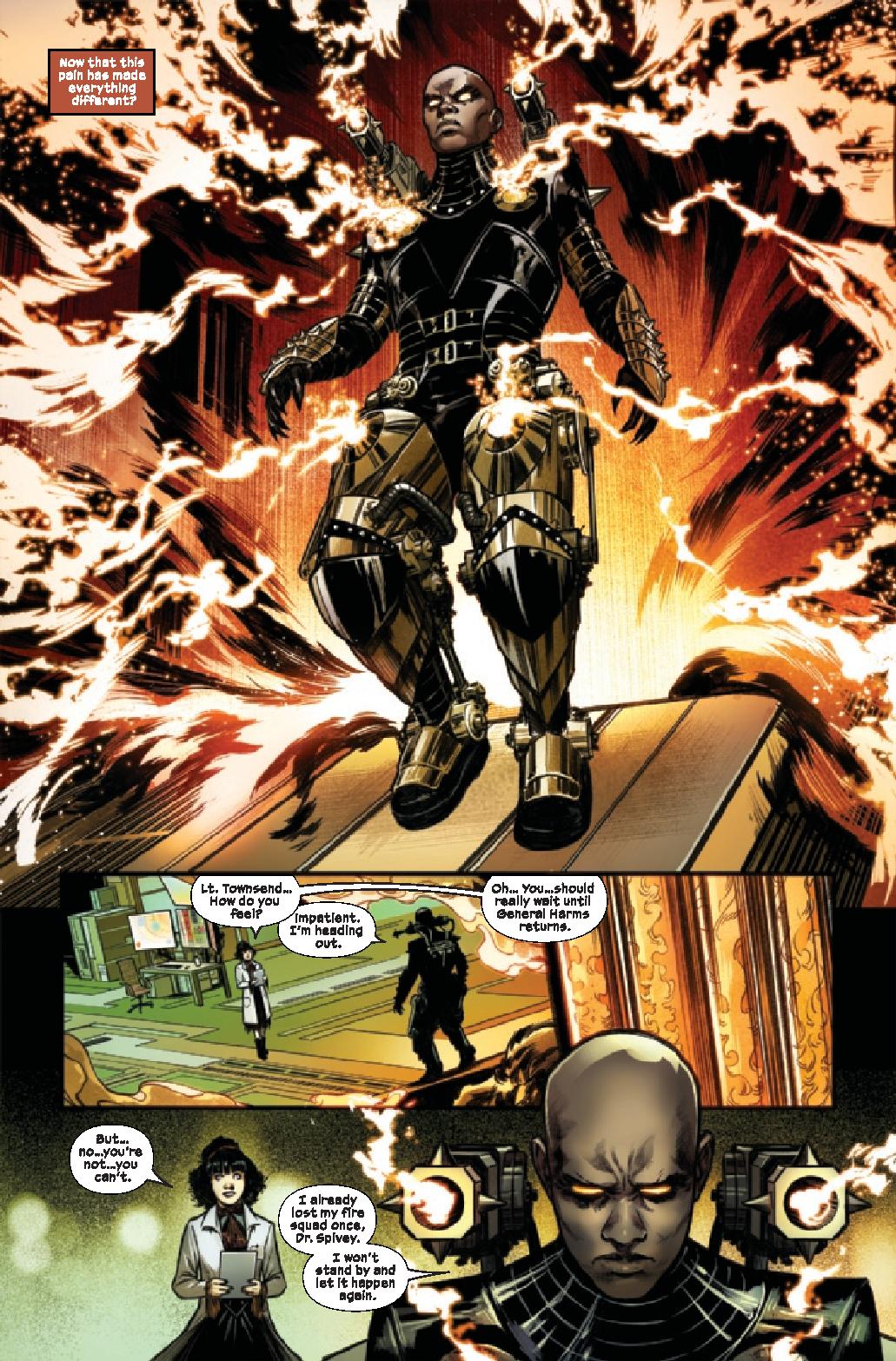 Written by Benjamin Percy, Hellverine #1 kicks things off with an introduction to the character and the origin story. It’s enough that those who aren’t familiar can get an idea of what’s going on that lead to this point. But, from there, the comic jumps around as Hellverine brings wicked punishment to the twisted and guilty and the army decides to play with hellfire.