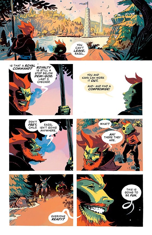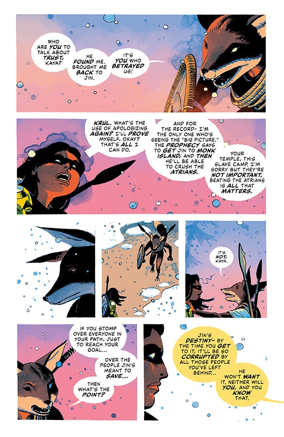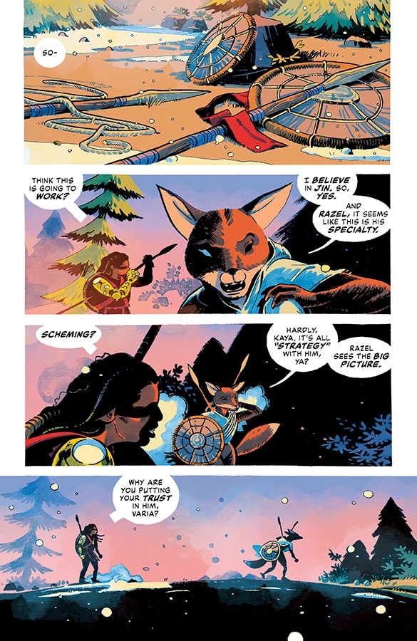 In Wes Craig’s Kaya #2, Kaya has formed an uneasy alliance with the Lizard-Riders. But will a flash flood and a dangerous hunt for food with the treacherous Zothan push Kaya past her breaking point?