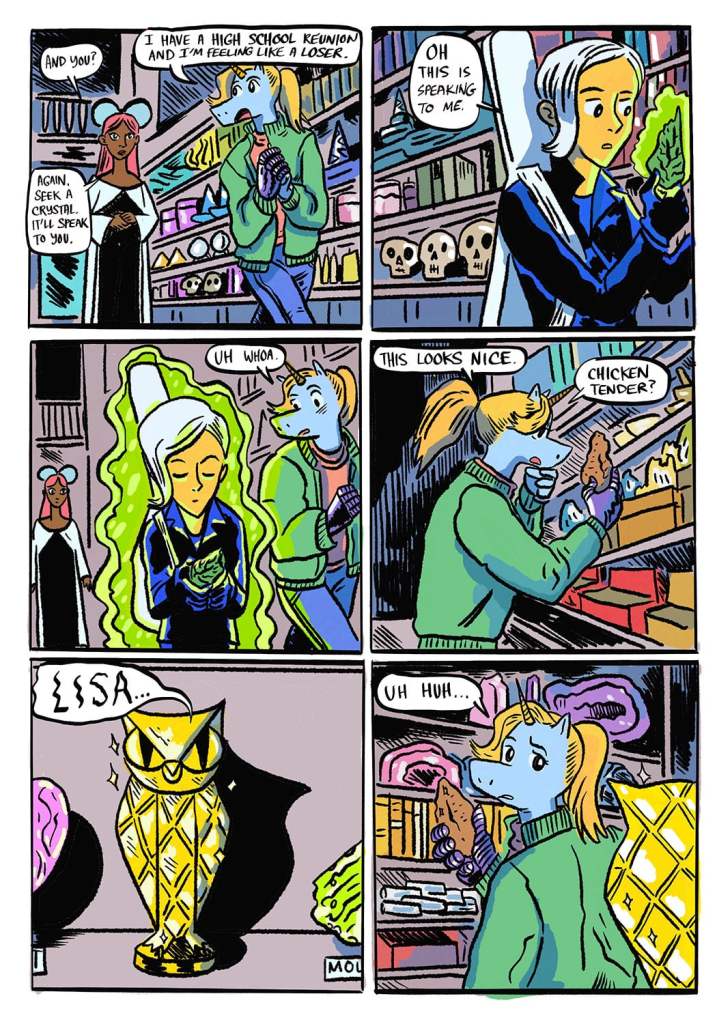 In Lisa Cheese and Ghost Guitar, a sweet unicorn girl from another dimension moves to Earth City hoping to make a name for herself as a folk singer…but her very first open mic is a disaster, leaving her with a bionic arm and an identity crisis. Now she’s starting a crummy office job, her parents back in their home dimension are laying on the guilt trip, and the cool girl at the record store leaves her tongue-tied. But once she’s drawn into a knock-down, drag-out encounter with a gang of hamburger-headed goons from the sinister megacorporation Beef is Burger, Lisa must rally a ragtag band of supernatural hipsters, conspiracy freaks, and burnt-out office coworkers to thwart their diabolical ambitions!
