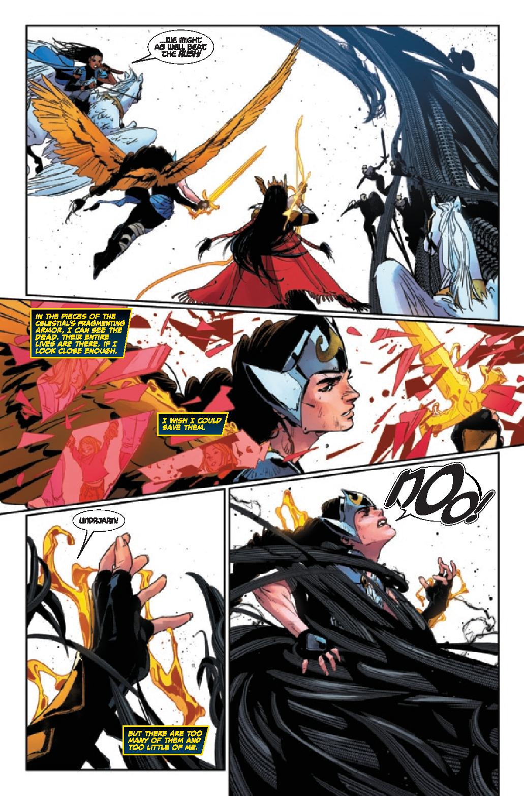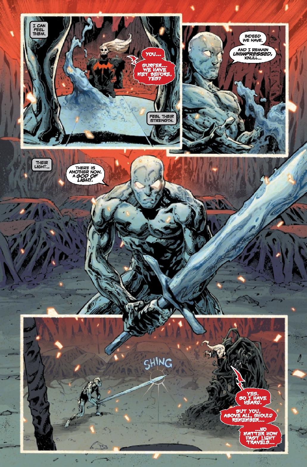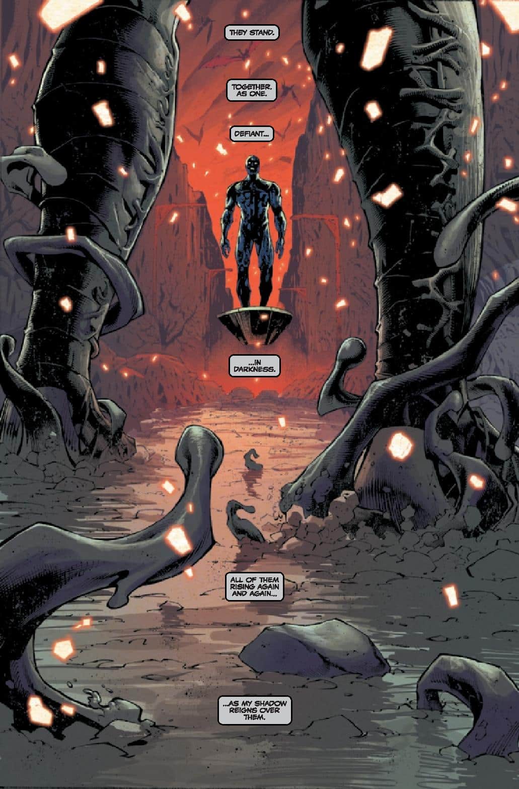 Cates focuses on these two’s battle so much that the rest of the heroes are generally and afterthought. They stand around and get one moment to look cool. But, beyond that, they don’t really do much and are a non-factor. For as much as various characters have been key in the main event, let alone the various tie-ins, they’re pretty much window dressing for this final issue. It’s an odd choice that takes some of the epic out of the nature of the battle.