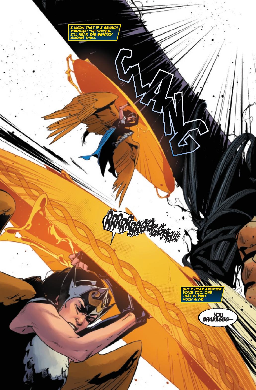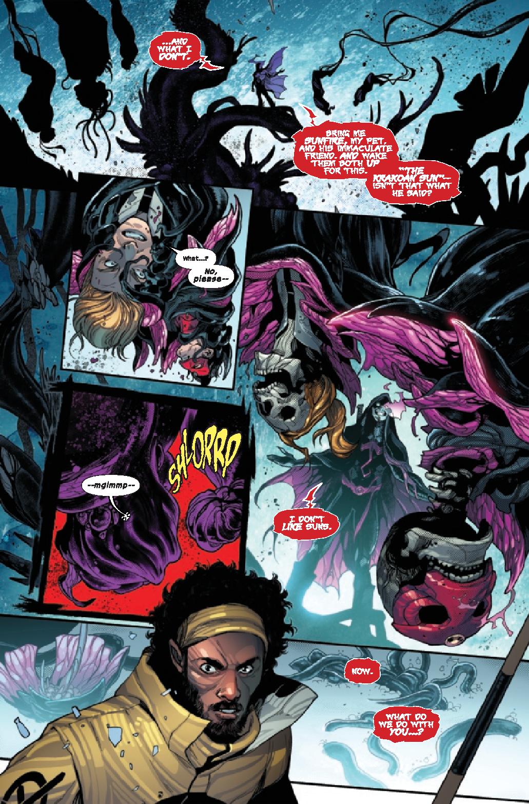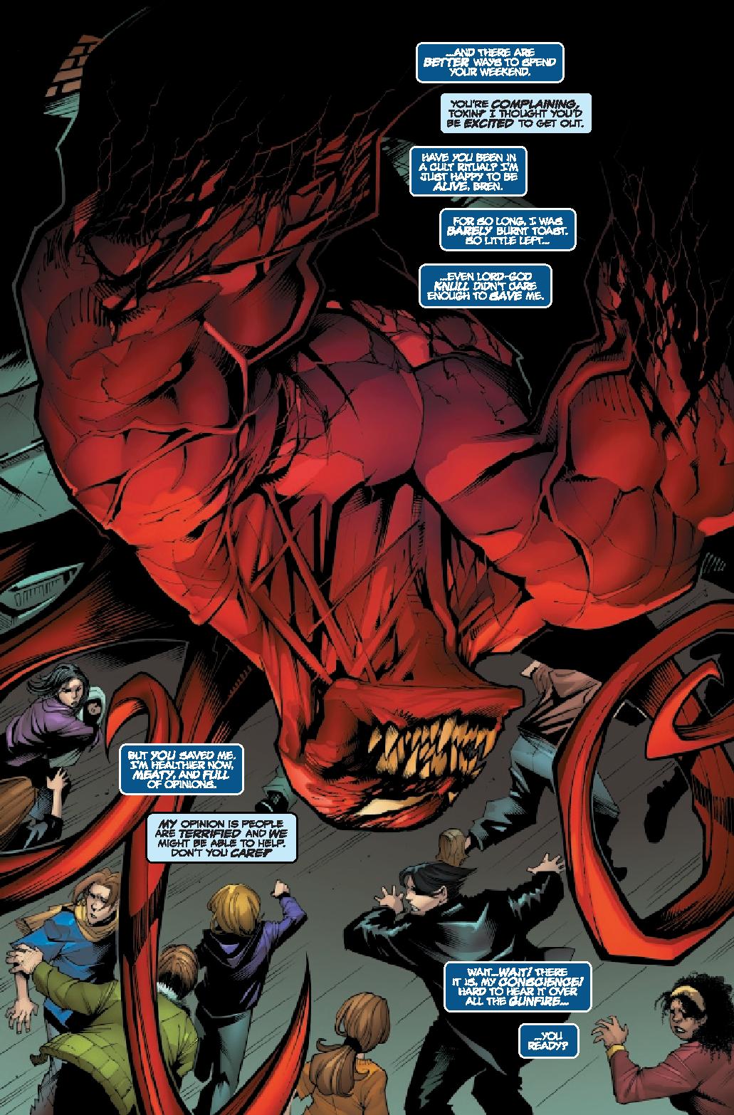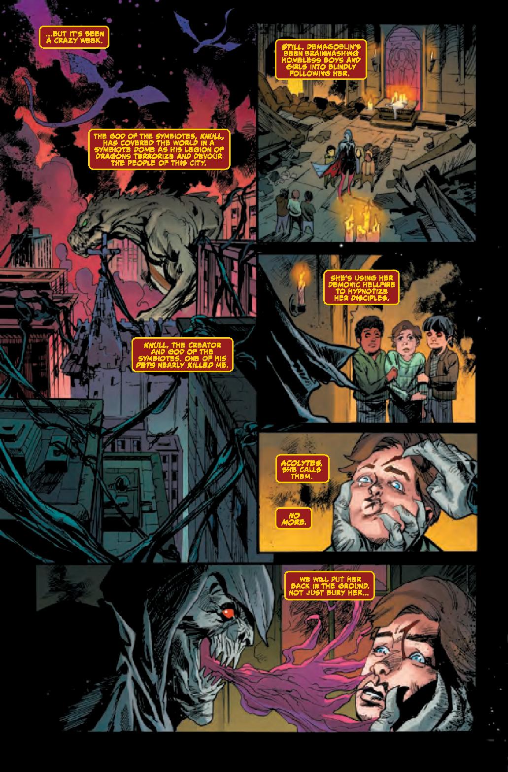 Clayton Cowles’ lettering continues to deserve mention for the series. The lettering really helps deliver and nail down Knull. With “normal” lettering, the character wouldn’t work as well. It’s a small detail and nice touch that really emphasizes the character and how “evil” he is.