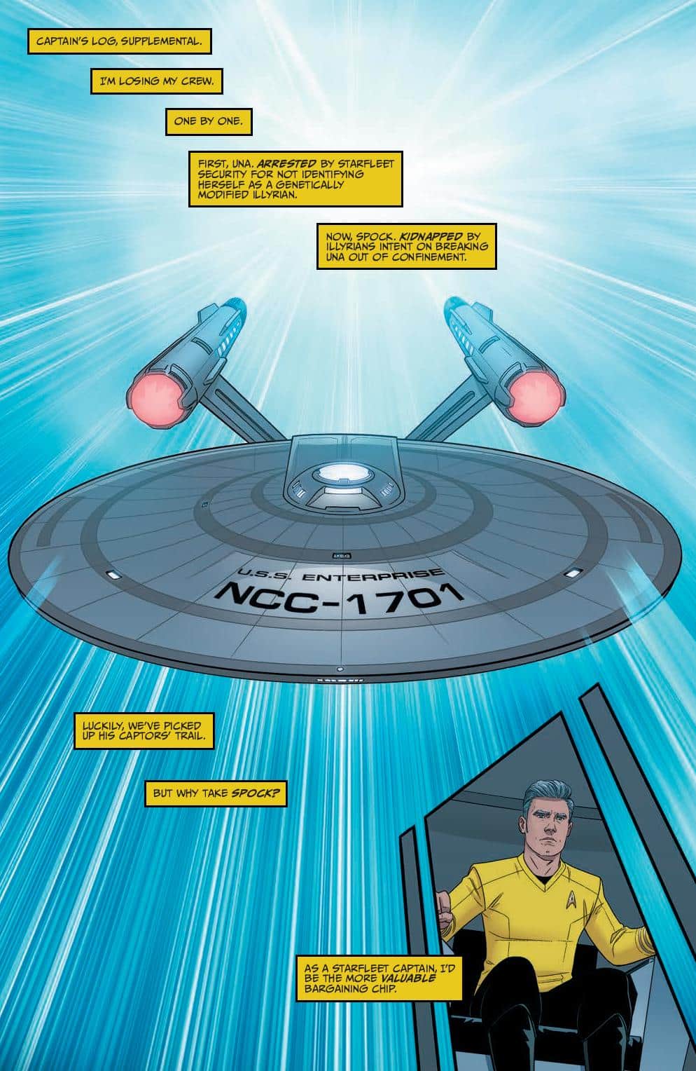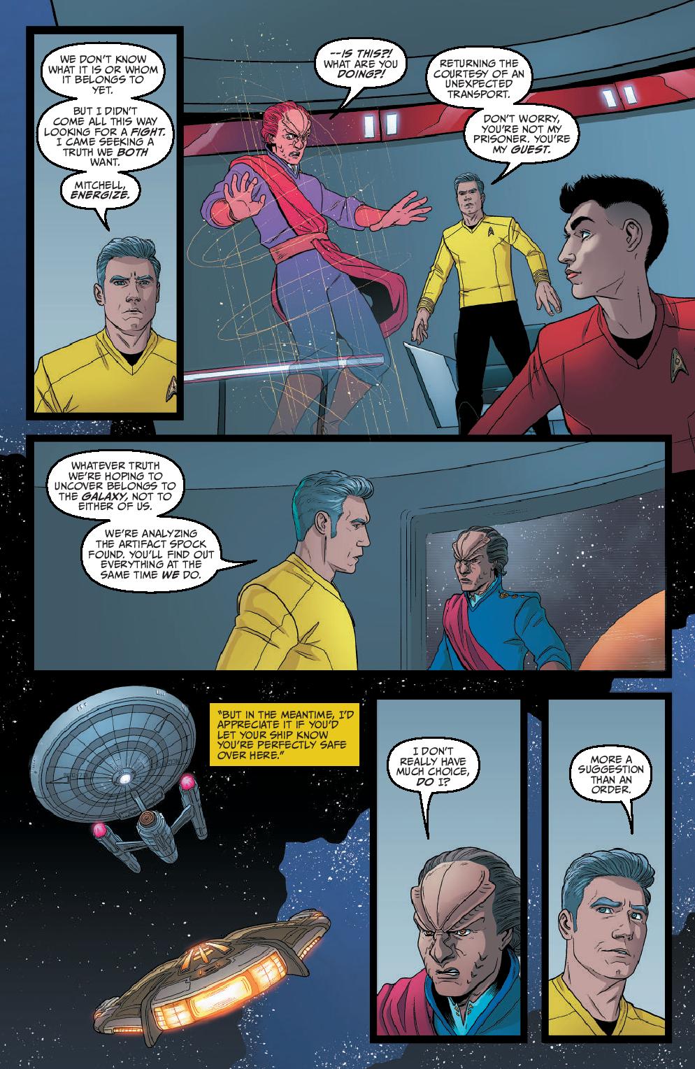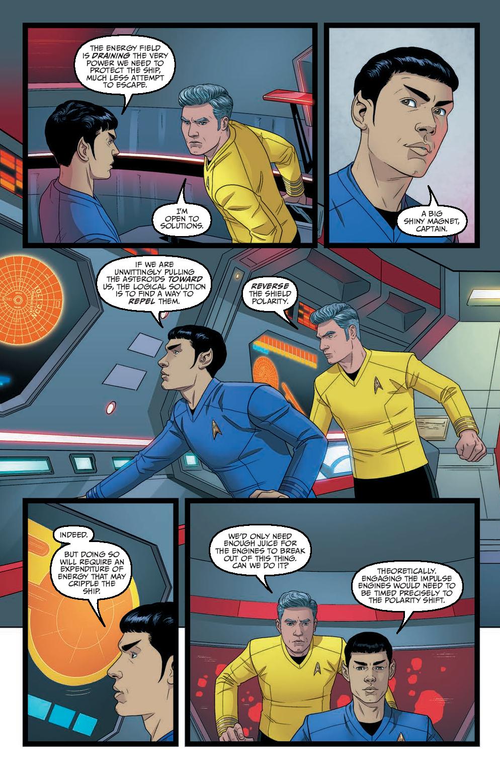As the Enterprise blitzes into the last leg of Zephyx’s space race from hell, the crew is confronted with a betrayal from within! The ship’s controls have been locked, and with Spock still separated from the crew, the crushing pressure of nearby stars, and Zephyx’s efforts to throw the ship off course, can Captain Pike ignore visions of impending doom long enough to see his crew to the finish line?