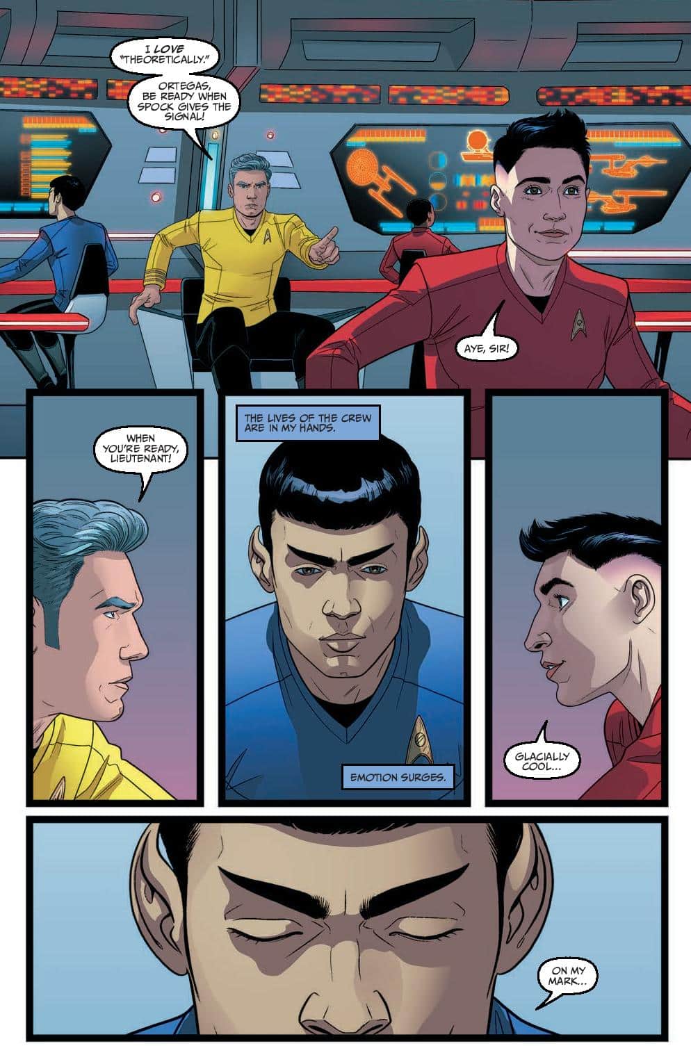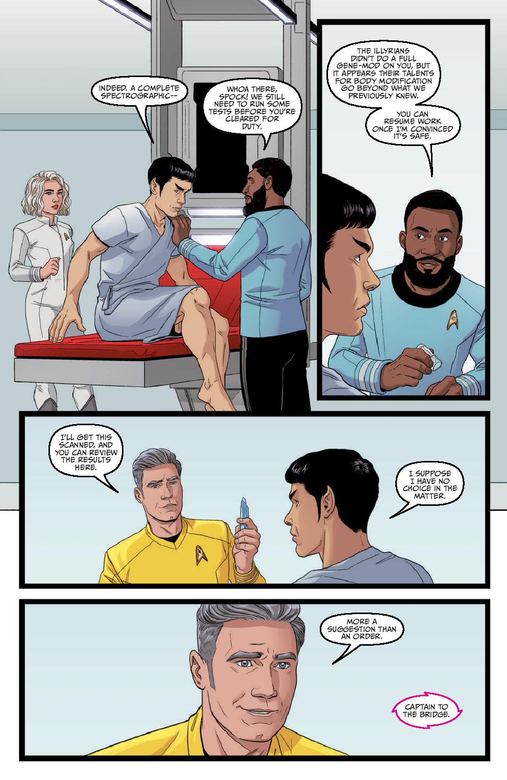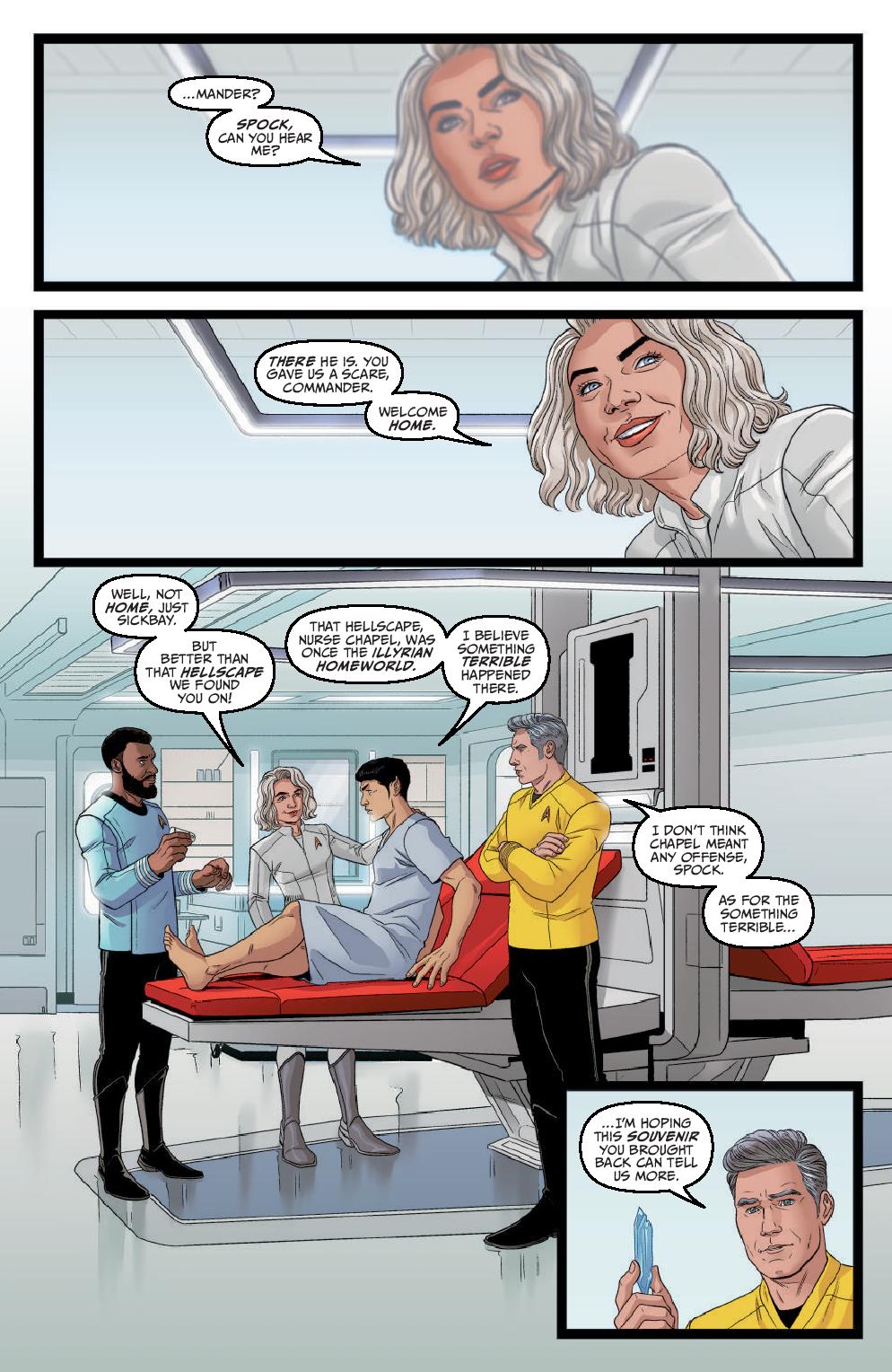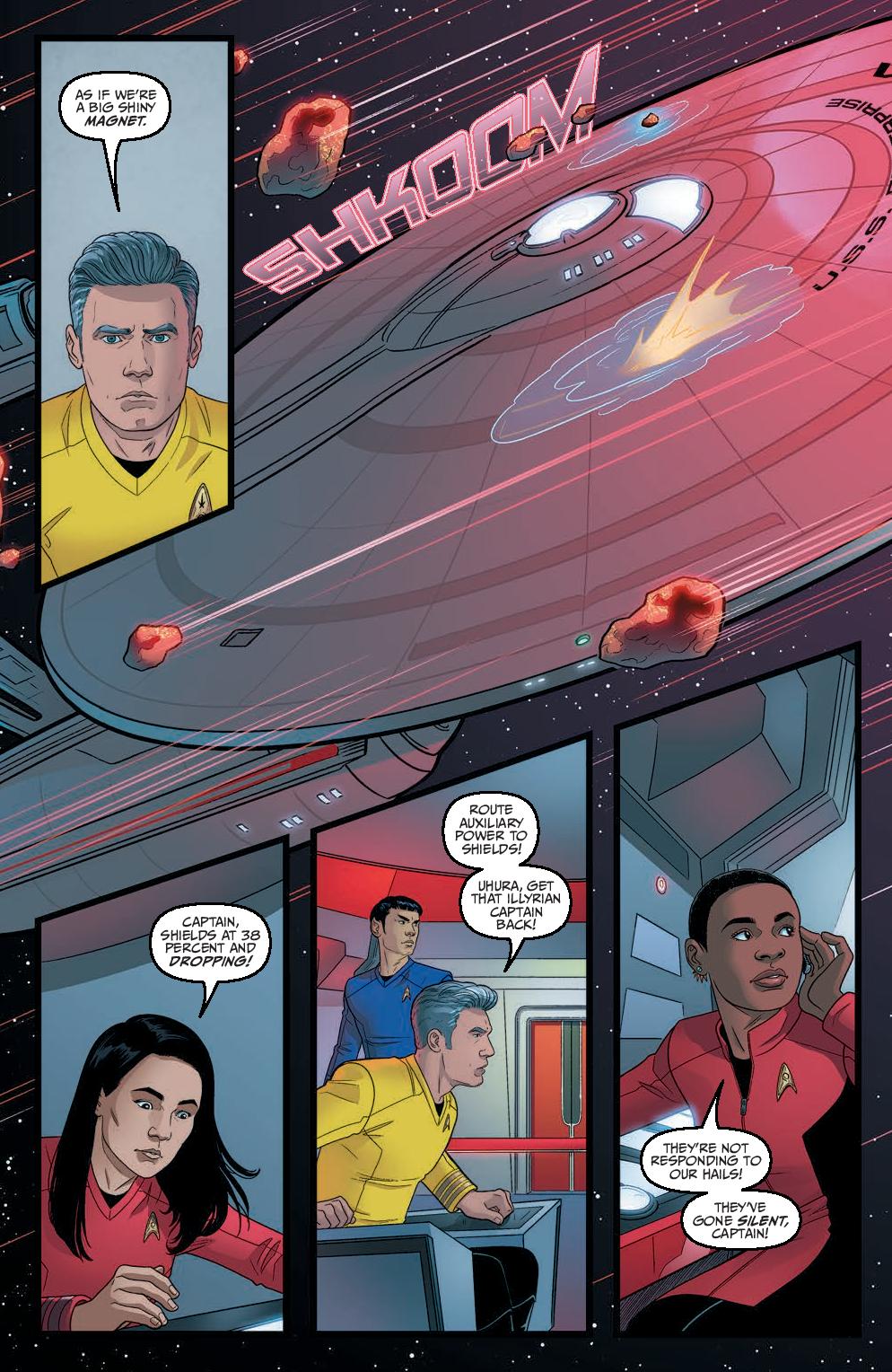 As the Enterprise blitzes into the last leg of Zephyx’s space race from hell, the crew is confronted with a betrayal from within! The ship’s controls have been locked, and with Spock still separated from the crew, the crushing pressure of nearby stars, and Zephyx’s efforts to throw the ship off course, can Captain Pike ignore visions of impending doom long enough to see his crew to the finish line?