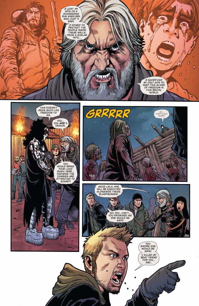Picking up decades after the fall of civilization, humans are now an endangered species isolated to strongholds such as the central New Detroit. These undead are attracted to sound, so music and all related iconography have been banned. Especially that of the greatest band in history. However, a group of teenagers are not going to live this way and set out on a quest to track down KISS! Who may ultimately be the ultimate weapon to turn the tide against the zombies! Sacks has described the series as a cocktail of Land of the Dead, A Quiet Place, Seven Samurai and even Footloose!