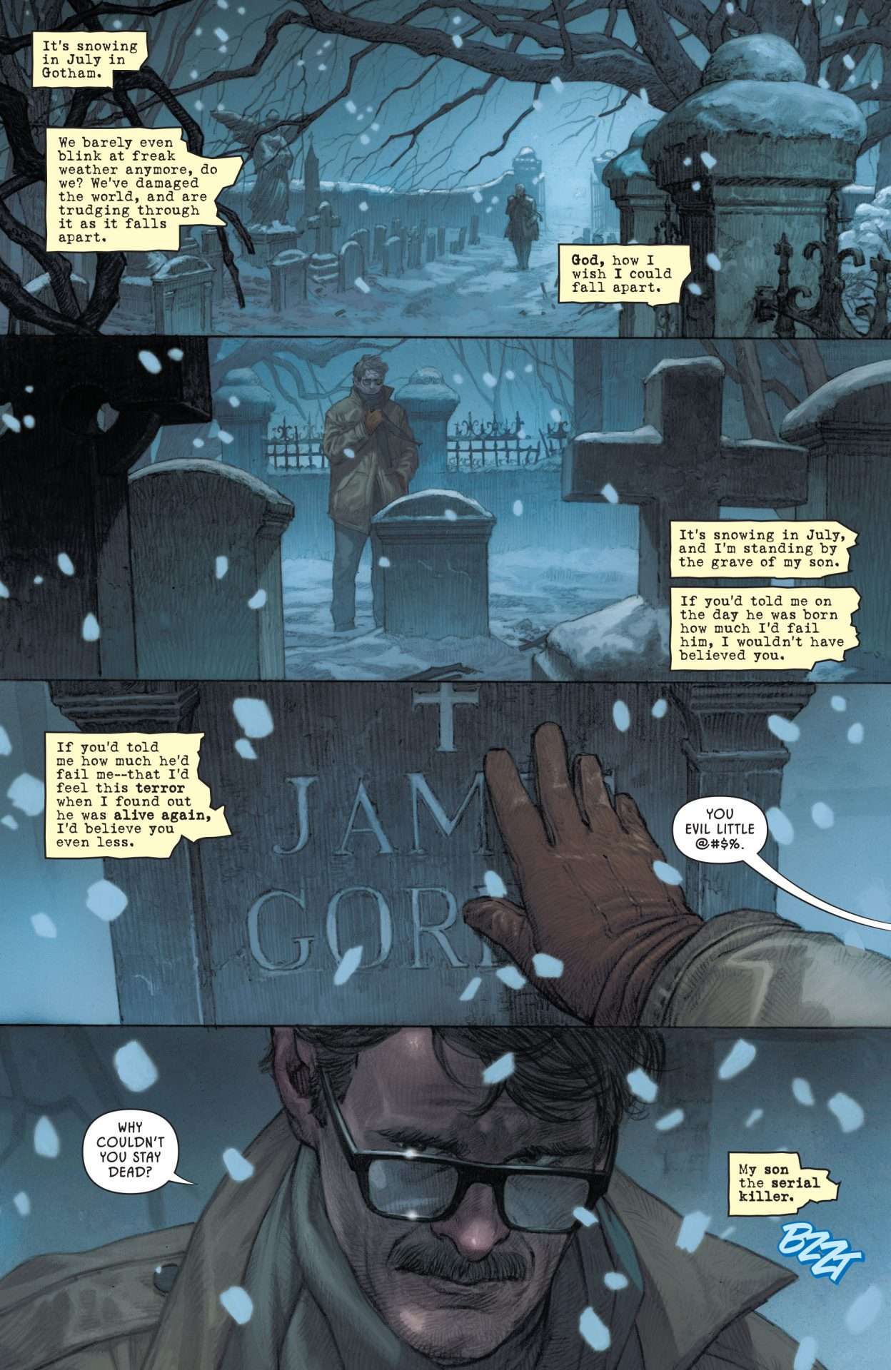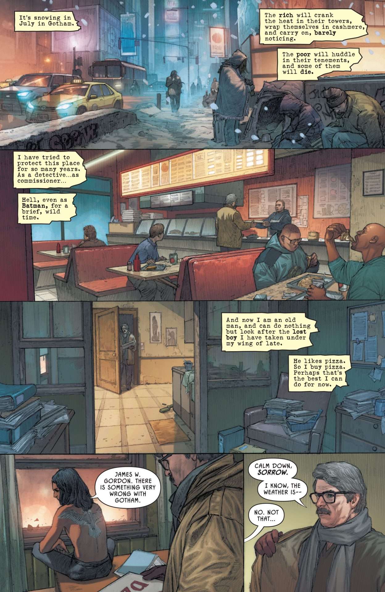 After seeing diamonds violently pour out of a woman’s mouth and the metal of his old Batman robo-suit soldered onto someone’s flesh to wear around Gotham…Jim Gordon slowly realizes that “the good people of Gotham” being represented by monstrous ideations of power, wealth, and knowledge…aren’t very good people at all. Jim’s investigation leads him to a mysterious clock, and he goes to Oracle for help to trace who or what is causing this nightmare…but whether he is able to wake up from it at all will be up to more than just himself.