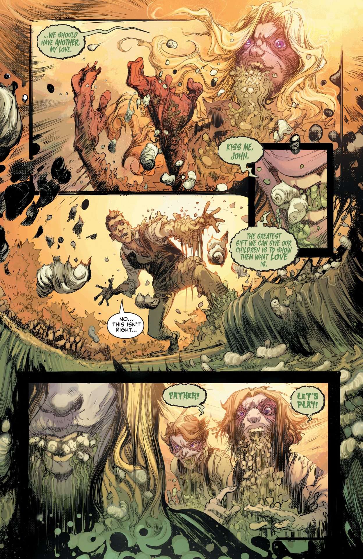 It’s another absolutely gorgeous and serene day in Pamela Isley’s lovely little new neighborhood in Knight Terrors: Poison Ivy #1 by Poison Ivy writer/artist team G. Willow Wilson and Atagun Ilhan! Everything and everyone here is wall-to-wall smiles! Nothing ever goes wrong, everyone is friends, and best of all, it’s made just for Ivy with lots and lots of love. Now, Pammy, don’t frown, don’t fuss, and don’t fret—just because this wasn’t what you thought you wanted, that doesn’t mean it won’t fit you like a glove! Have some pie, dear, don’t think too hard, and just smile. Knight Terrors: Poison Ivy #1 hits comics shops on July 4 with a main cover by Jessica Fong, open-to-order variants by Leirix and Jamie McKelvie, a 1:25 variant by Nimit Malavia, and a 1:50 variant by Jessica Dalva. Dustin Nguyen will also provide a Midnight variant cover.