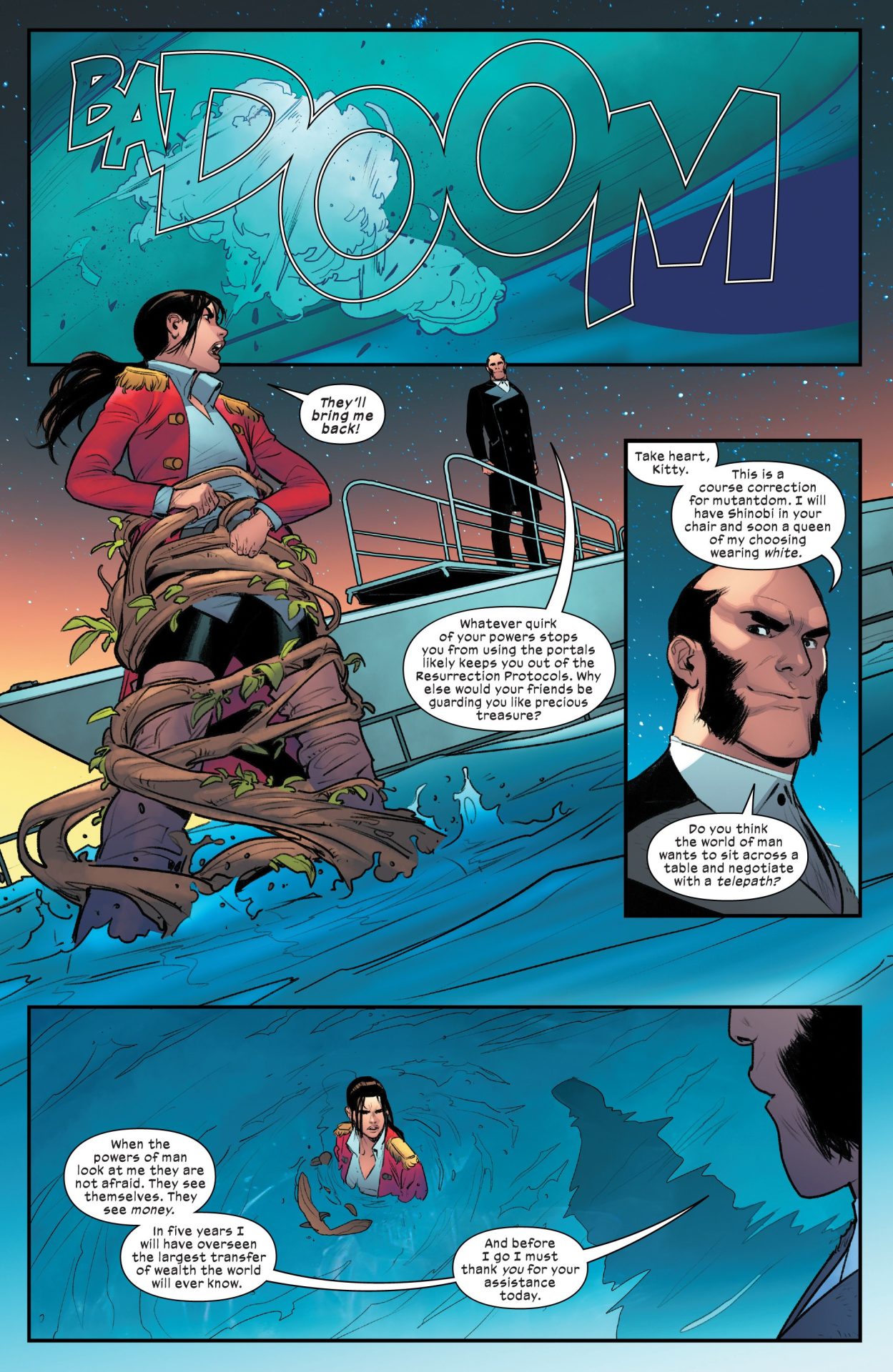 Sebastian Shaw’s inclusion on the council is troubling as well. With his history of abuse and manipulation of both Jean and Emma, who are forced to sit on the council with him, he too should not be permitted to hold such a seat of authority. We learn in X-Men Black: Emma Frostthat Shaw also abused and exploited a number of underaged girls “employed” by the Hellfire Club. Shaw has long been an avatar for anarcho-capitalist ideology, a “radical” offshoot of capitalism that focuses on individual and decentralized wealth through participating in unregulated “free” markets. To put it plainly, Shaw is a monster whose sole impulse is self-interest with no allegiances of value. He constantly demonstrates a disregard for mutant identity, throwing mutant-kind under the bus for his own gain. Shaw’s behavior after stepping onto Krakoa represents one of the ills that restorative justice models aim to address, the cycle of abuse left unchecked. With the resources afforded to him by his seat on the Council Shaw wastes no time in conspiring to destabilize Krakoan infrastructure. In fewer than nine issues of Marauders, readers watch Shaw install his own agents into seats of authority [two of which are literal Nazis] and they watch him undermine Krakoan pharmaceutical-trade by disseminating faulty Krakoan drugs to bad-jacket Krakoa. Shaw collaborates with Hominus Verendi, hires X-Cutioner & Hatemonger to attack the Marauders, establishes ties with the Russian Ambassador responsible for developing power-dampening technology, and conspires with Verendi on a plot to use the Yellowjacket Probe to provide various anti-mutant parties with direct intelligence on Krakoa. Not to mention that Shaw murdered Kate Pryde.