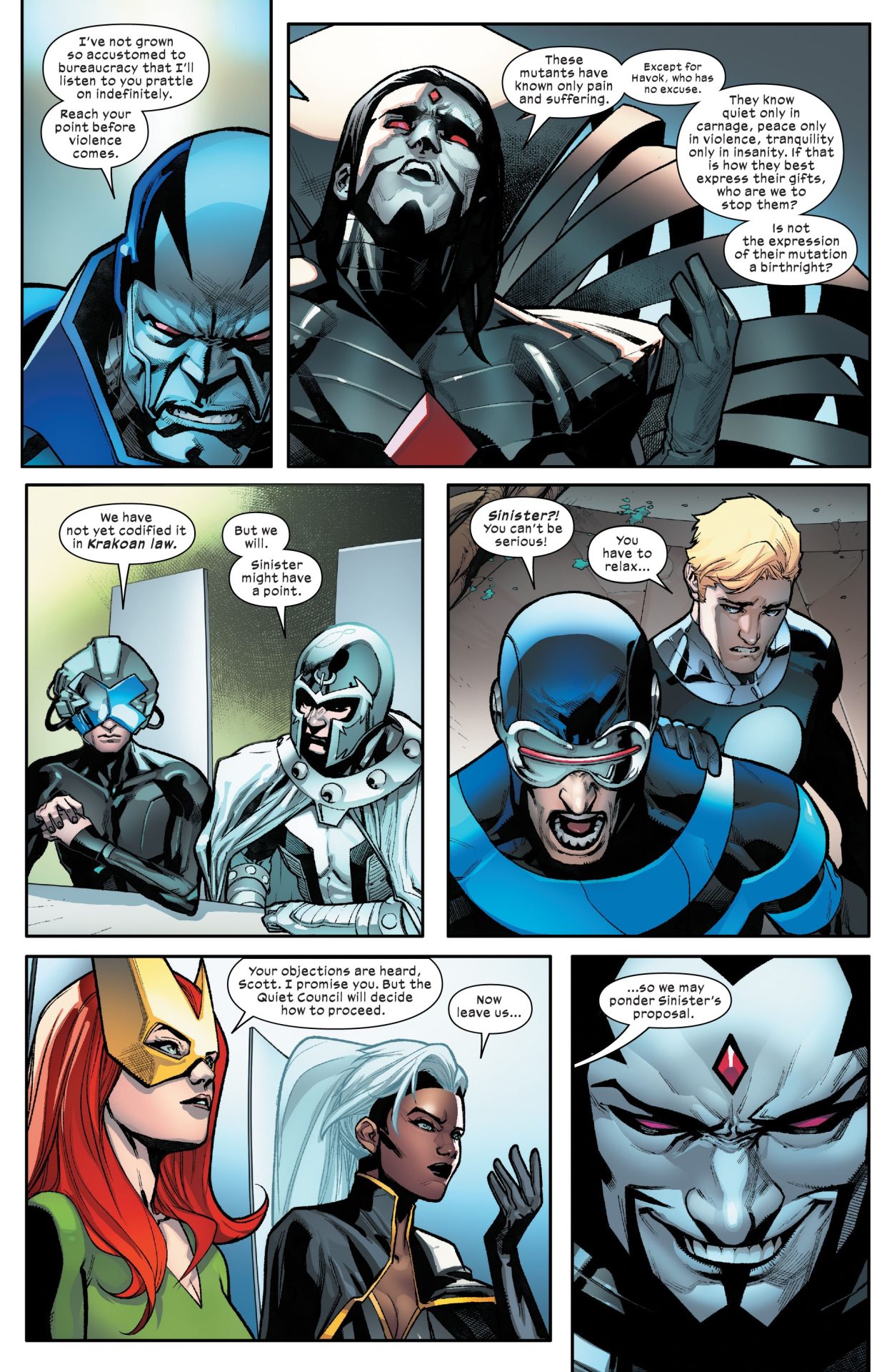 The Council does include some explicitly villainous figures. One such figure is Sinister, who has a history of manipulation, abuse, and violence that should exclude him from holding such a position of power. One of the major offenses that should preclude him from holding a seat of authority is his orchestration of the Morlock Massacre. Sinister is responsible for the destruction of hundreds of lives, but because he possesses something that Xavier wants, his genetic archives, Xavier ignores the damage he’s done for his own gain. As a result, Sinister is given power over the very community that he previously attacked. Morlocks don’t even live on Krakoa but in a habitat somewhere in Arizona. Whether this is an empowered choice or not is unclear. Did they choose not to live on Krakoa? Or did they specifically choose not to live alongside their abuser, Sinister? Needless to say, in restorative justice models, you don’t put a violent abuser on the single body of authority within a community and give them further social & institutional power over their victims, while you force his victims to live outside of the community-proper.