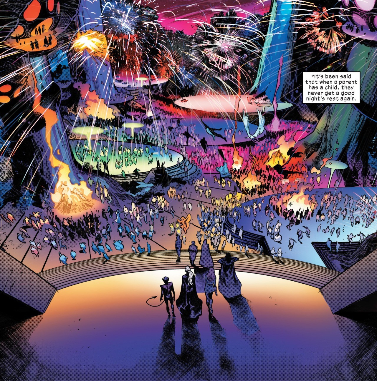 Java Tartaglia also uses flat, stark colors to show how much of the crowd has embraced the Crucible as Krakoa’s proverbial theory of everything. However, he, Quinn, and Spurrier hint at another way when Lost calls Nightcrawler a “kindly one” an allusion to the Greek play Eumenides, which showed the vengeful Furies becoming the protective Kindly Ones.