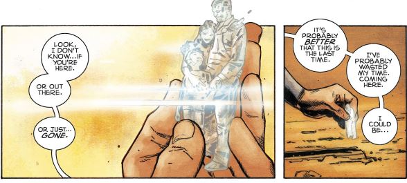 Tom King makes a case for winning back to back Eisners for Best Short Story in his, Clay Mann, and Jordie Bellaire’s contribution to Action #1000, “Of Tomorrow”. It’s a tone poem about Superman’s last day on Earth as he says goodbye to Ma and Pa Kent one last time as the Earth is engulfed in the sun with flames and winds that are reminiscent of the last days of Krypton. King writes Superman as an old man wrestling with his past and legacy, wishing he could save more people, and being supremely proud of his wife and son. And it gets deep at the end when he reflects on his father’s blend of science and faith. Mann captures each tiny, beautiful moment in his artwork as he makes art with his strength, tears, and freeze breath: a frozen statuette of Jonathan and Martha Kent like the one of Jor-El and Lara-El in the Fortress of Solitude. Bellaire goes for Earth tones in her colors as Superman immerses himself in his adopted planet before flying off forever. He loves his parents, he loves Earth, but he realizes that all planets die and all story ends. (Except for his comic book for now.)