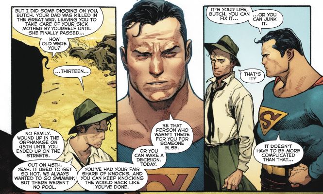 Geoff Johns, Richard Donner, Olivier Coipel, and Alejandro Sanchez turn in a stoic, 1930s era Superman story about a small time crook named Butch who gets his car beat up when trying to fight Superman. It’s probably the car from the cover of Action Comics #1. Johns and Donner’s take on Superman is a little rougher and little more stern, but he has a solid moral compass and cares for humanity as shown by his empathy towards Butch, who lost his dad in combat during World War I. Coipel’s art is wonderfully rough hewn and is like Norman Rockwell’s work without the sentimentality, and he even plays the “It’s a bird, it’s a plane…” line for sardonic, silent comedy. His Superman commands the page and is someone who you would listen to and definitely take seriously. He doesn’t smile either. But the ending of “The Car” has an earned happiness and is a little spark of light in a cynical world. Johns and Donner really get that heroism is about the little things and not flying the world backwards or time travel shenanigans.