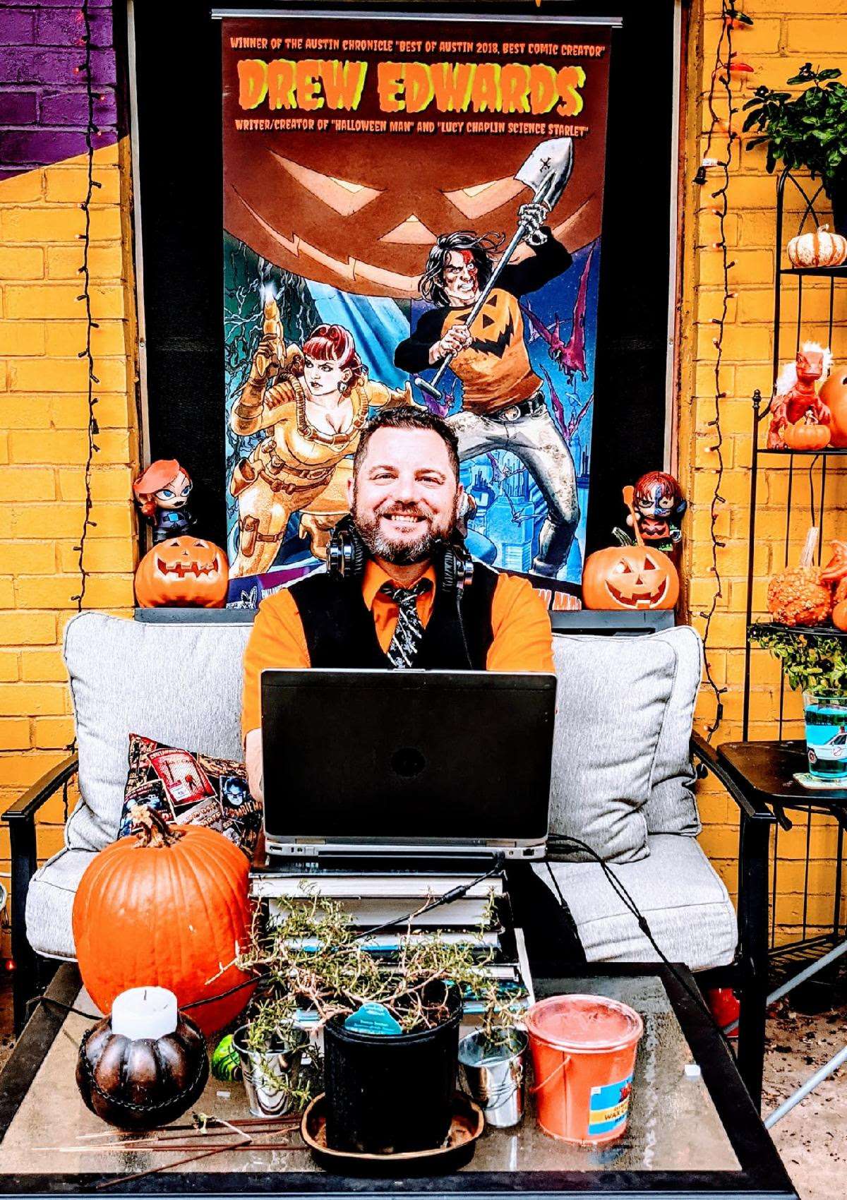 Edwards is a Best of Austin Winner, Ringo Awards Nominee, and member of the Pen America Fellowship of Writers. Best known as the writer and creator of the long-running underground comic book series, Halloween Man, thousands tune in each week to hear him as a cast member of the horror movie podcast Castle of Horror. Known as “Howlin’” Drew Edwards to many musicians, he’s helped bridge the horror and comic culture worlds with Austin’s legendary music scene with Halloween Man Productions’ annual “Punk vs. Rockabilly” showcase during SXSW.. Drew currently lives in Austin, Texas with his wife, musician/activist Jamie Bahr, and a pair of lovable bunnies.