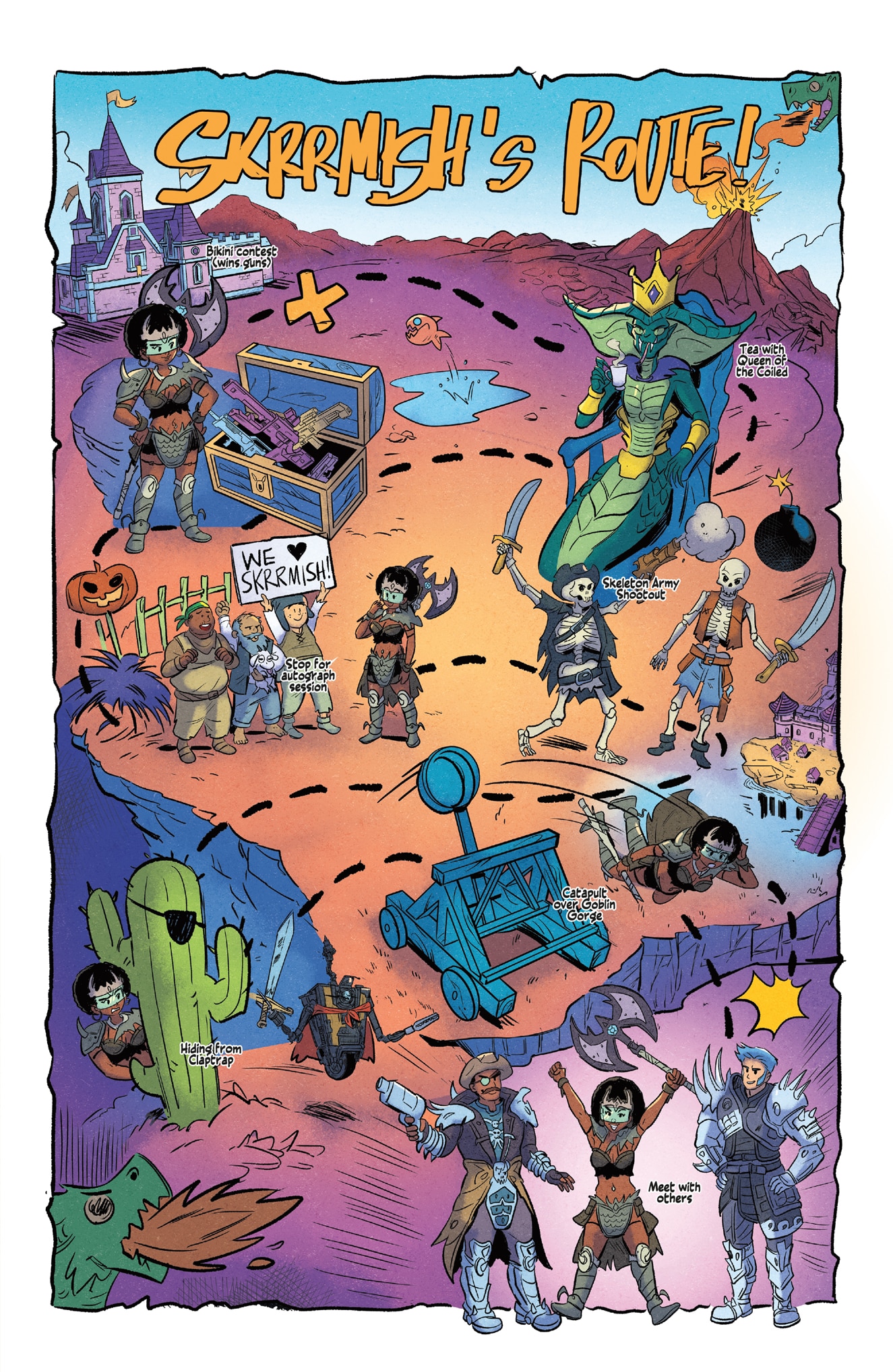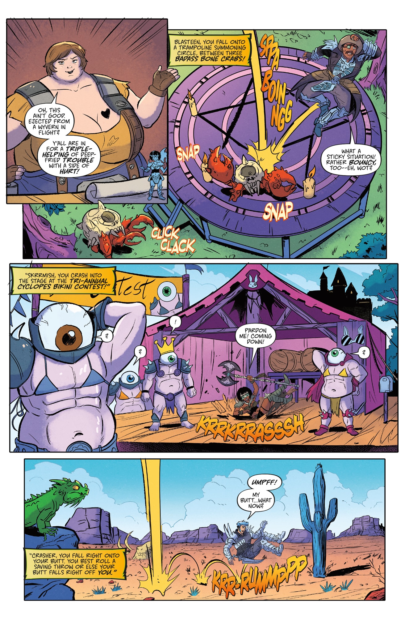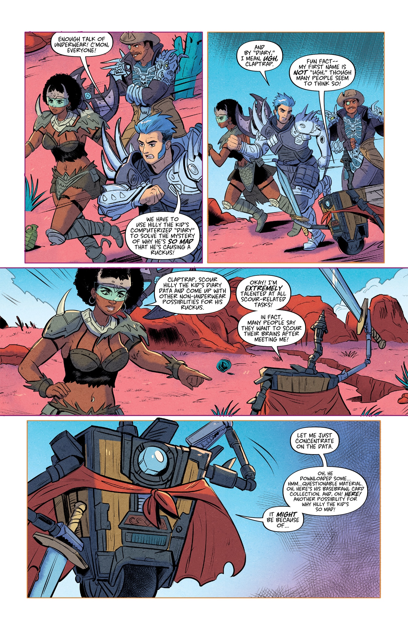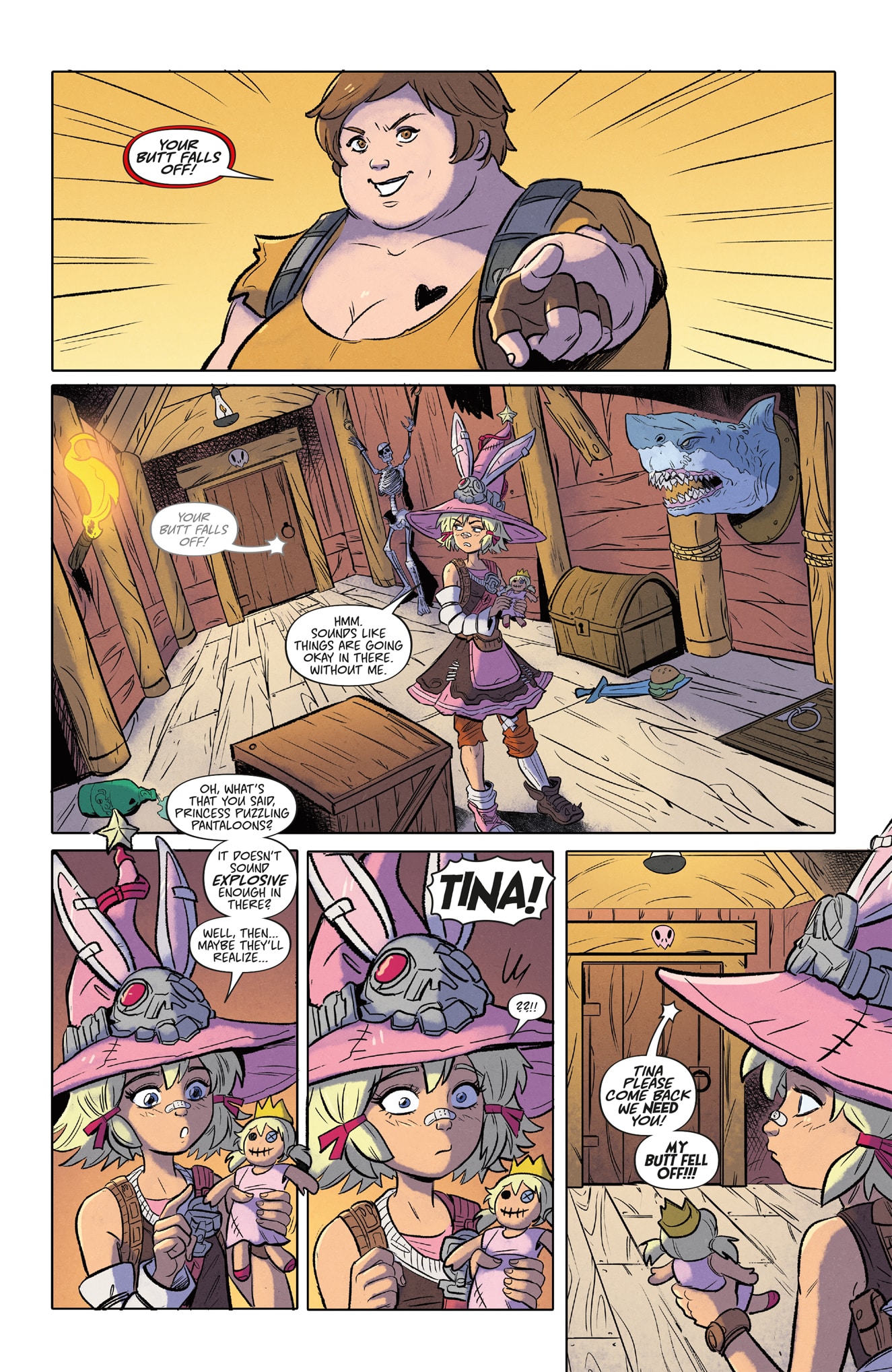 A new comic tie-in to video games Tiny Tina’s Wonderlands and Borderlands! Tiny Tina is running a new game of “Bunkers & Badasses” with explorers Frette, Valentine, and Hammerlock playing as Skrrmish the Bogbarian, Crasher the Stabbomancer, and Blasteen the Deadshot! Playing in a world from the colorful mind of Tiny Tina, the three heroes set off to hunt a bounty on the giant Hilly the Kid!