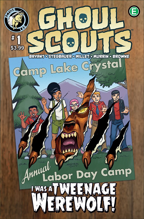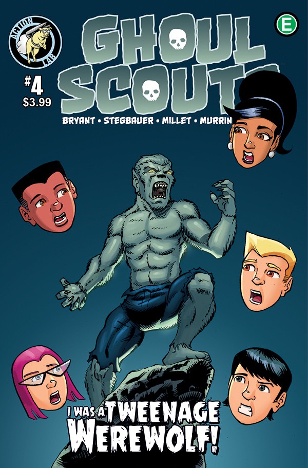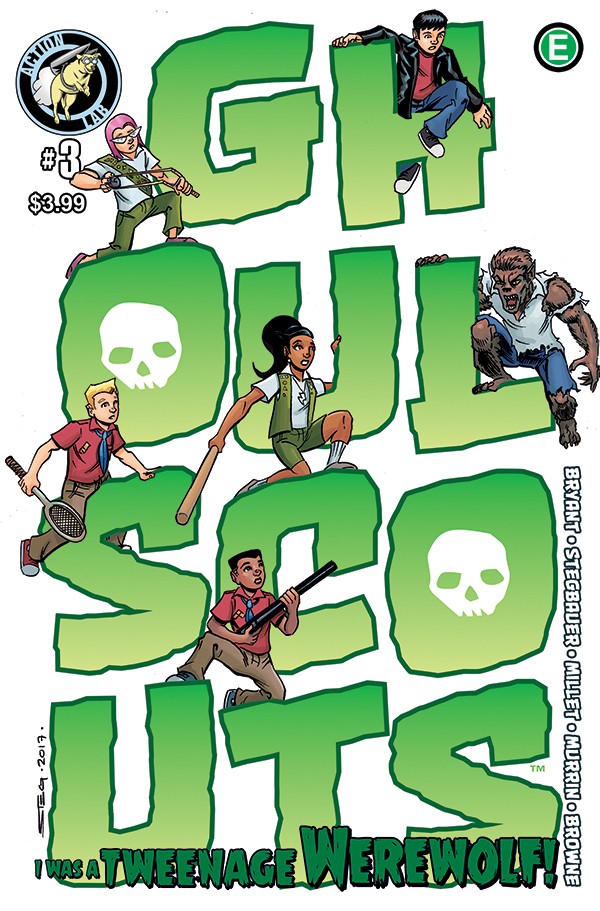I admit that I’m kind of late to the Ghoul Scouts: Night of the Unliving Undead party, by three whole issues. I’m joining in at the end of an arc and with no knowledge of the series , issue #4 is a pretty nice stand alone entry into the series and a damn good reason to pick up the three issues that preceded it. Steve Bryant tells a very good tale of a group of kids trying to save their town from hordes the undead and some other supernatural creatures. He takes a story that has been done in a million ways and structures it in a way that seems original.Issue #4 of Ghoul Scouts: Night of the Living Undead focuses on our gang of underage zombie slayers trying to get through the woods , to gain access to a spooky manor, to stop the threat to their town. The whole scene is set up like the end stages of the original Lost Boys and that’s a damn good thing. We get to watch as our young heroes try and restore the town to the normal sleepy village it once was by going up against a small zombie army and a possible double agent wolf man.