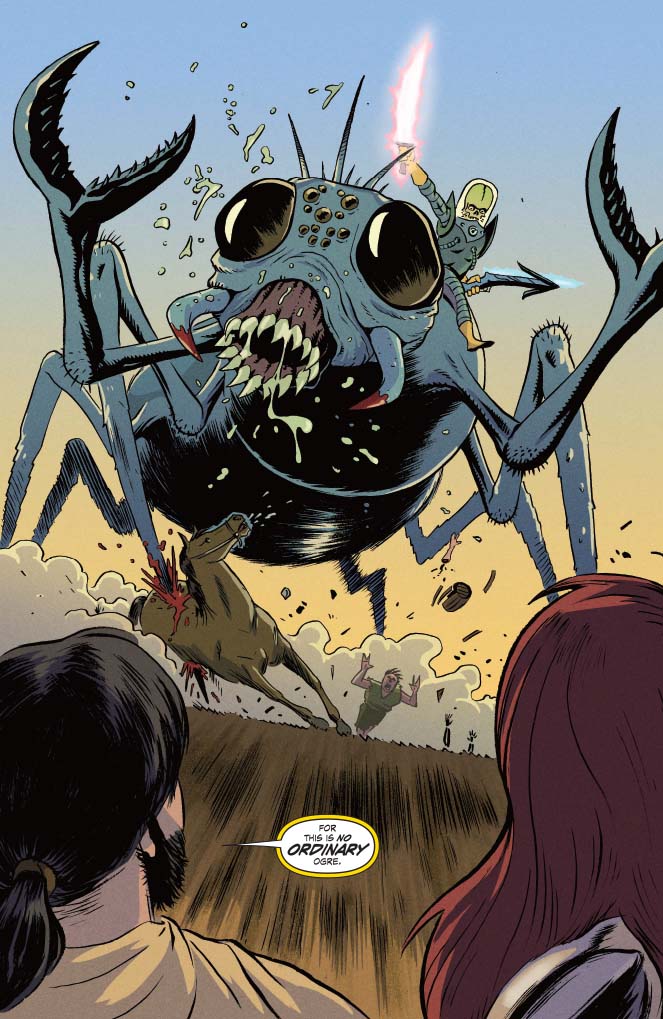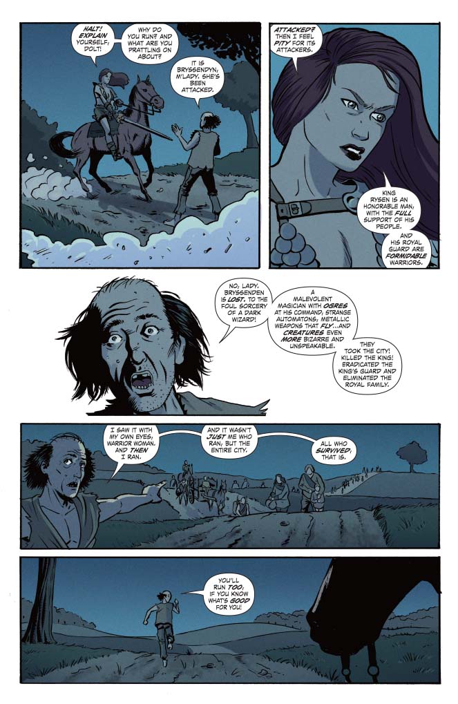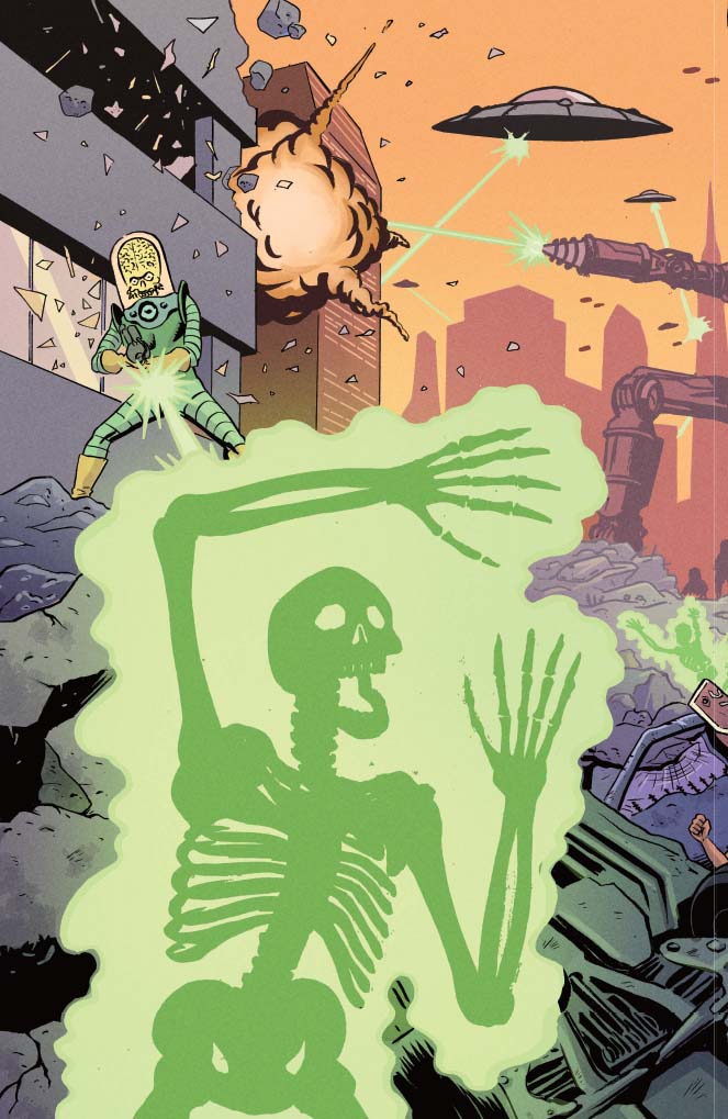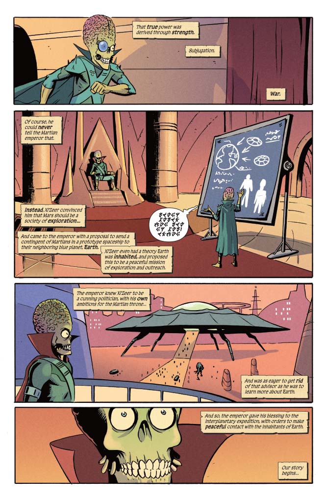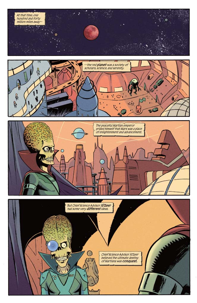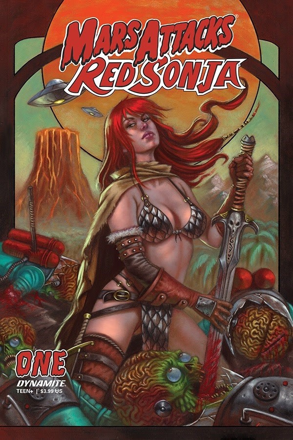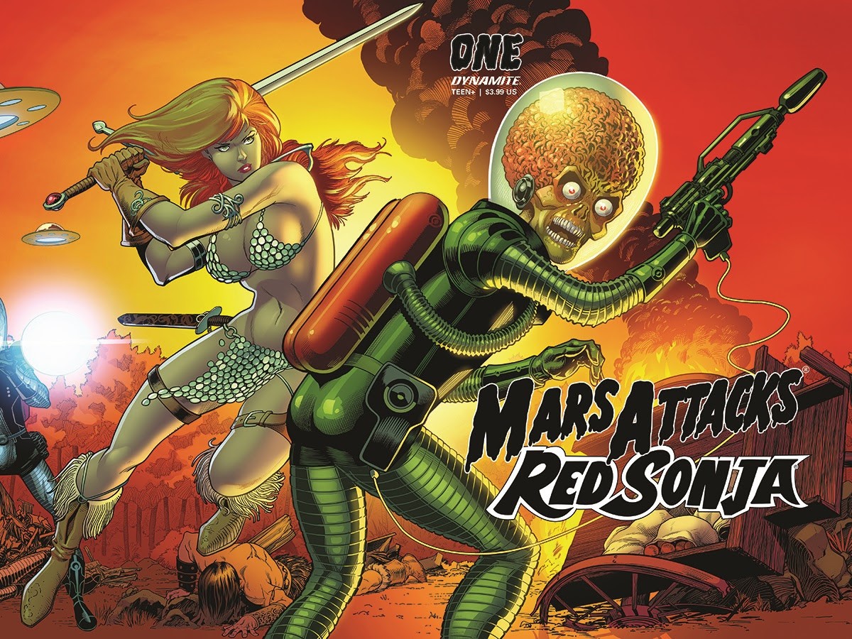 Yes, those dastardly Mars Attacks Martians are attacking again, and these are the Martians of old, the Martians of the Hyborian Age. And so, it’s up to Red Sonja to stop the attack. But how will steel, strength and savagery stand again laser guns, sci-fi technology and weird, weird Martian science? Only one way to find out!