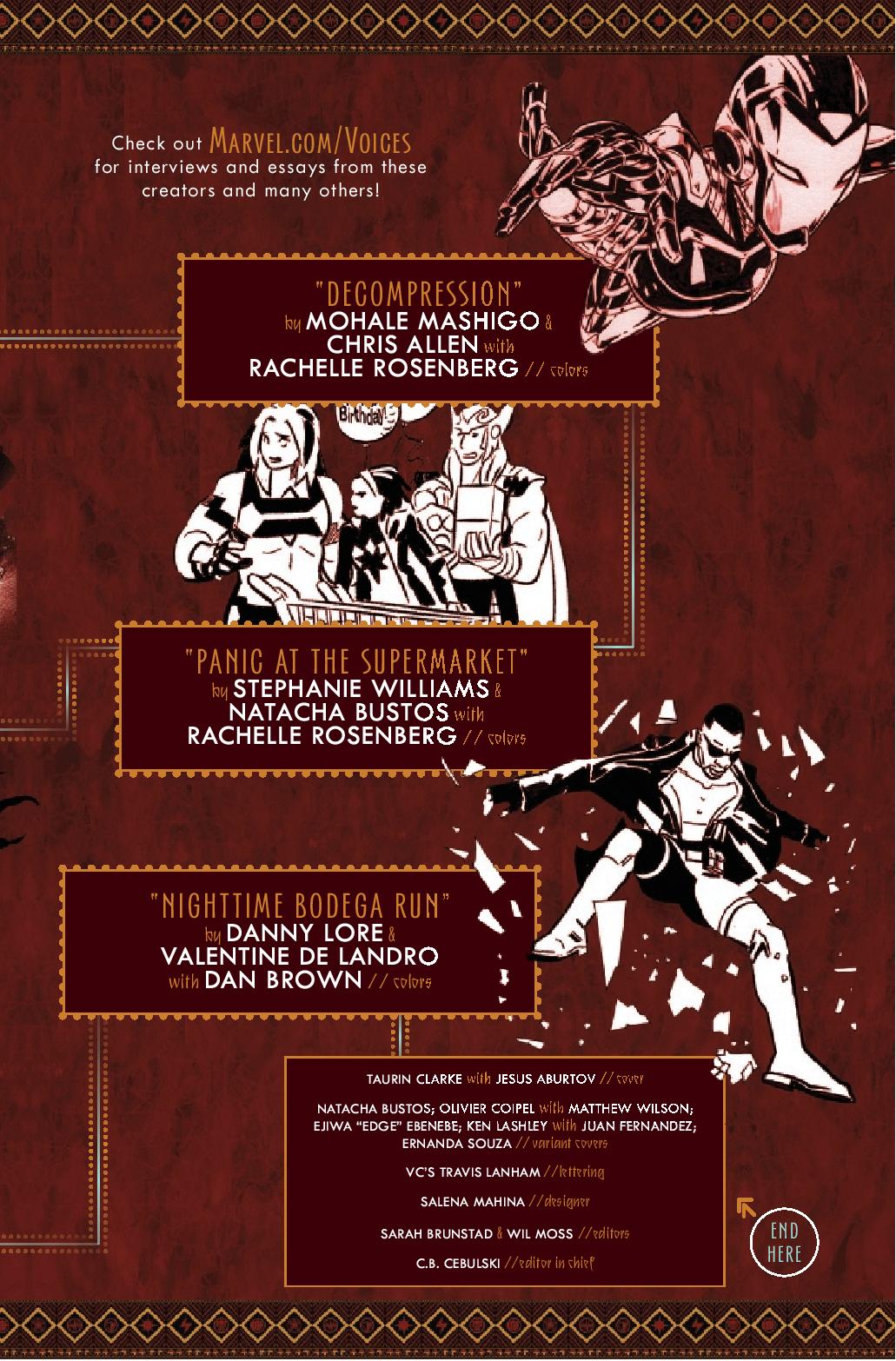 Marvel’s Voices: Legacy #1 will consist of seven thrilling tales brought to life by an amazing lineup of both new and established creators. Academy Award winning screenwriter John Ridley kicks things off with a poignant look at the impact of Miles Morales. Award-winning novelist Mohale Mashigo pens an action-packed teamup of Marvel’s most promising young heroes—Ironheart, Ms. Marvel, and Shuri. Singer/songwriter Saint Bodhi shares her take on Storm in an emotional story grounded in tragedy and acceptance. Author Tochi Onyebuchi makes his Marvel Comics debut with a high-octane tale of a wild night in Madripoor starring Domino. Writer Stephanie Williams highlights family in a light-hearted Monica Rambeau story. Writer Danny Lore explores Blade’s legacy—both vampiric and heroic. Finally, Eisner Award-winning writer Nnedi Okorafor explains the importance of heroes in fights for justice and reform in an unforgettable Venom story.