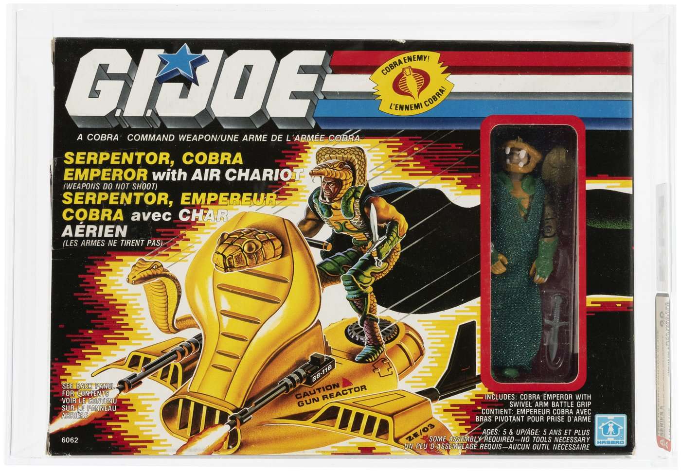 One of the biggest events of a young boy’s life in the 1980s may very well have been when Dr. Mindbender combined the DNA of history’s greatest leaders to create Serpentor. Not only was there now a chance Cobra might actually get some stuff accomplished, he had an awesome name, a great costume and a frickin’ snake-headed air chariot. So owning the toy was like a dream come true! Relive that glory with this graded example, with amazing box art and bilingual packaging. Vive la Cobra!
