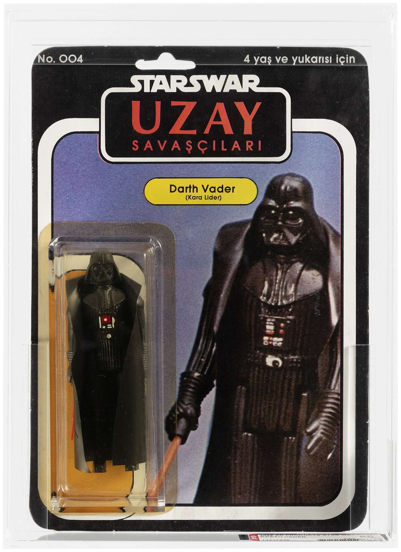 Star Wars was a global phenomenon, but not every country enjoyed Star Wars in the same way. Turkey, for example, enjoyed it as “Uzay Savascilari,” and knew Darth Vader as “Kara Lider”. They also got their unlicensed action figures from a company called SB Products, which hit stores in 1988 and featured card art of the actual toys, as opposed to movie photos. Carded examples are rare, and this one has the highest recorded grade.