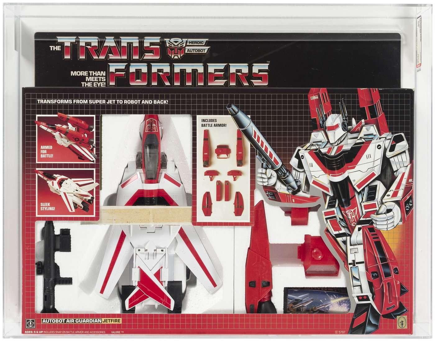 One of the most egregious examples of mold re-use in the Transformers line, Jetfire famously used a Super Valkyrie toy from the anime series Super Dimension Fortress Macross, which had already been (briefly) released on VHS in the US by 1984, and would appear as part of Robotech in 1985. That’s probably why the cartoon version of Jetfire looked very, very different, but that doesn’t make the toy look any less cool. With the large packaging window and amazing box art (front and back), you almost don’t care that it’s sealed in a graded case.