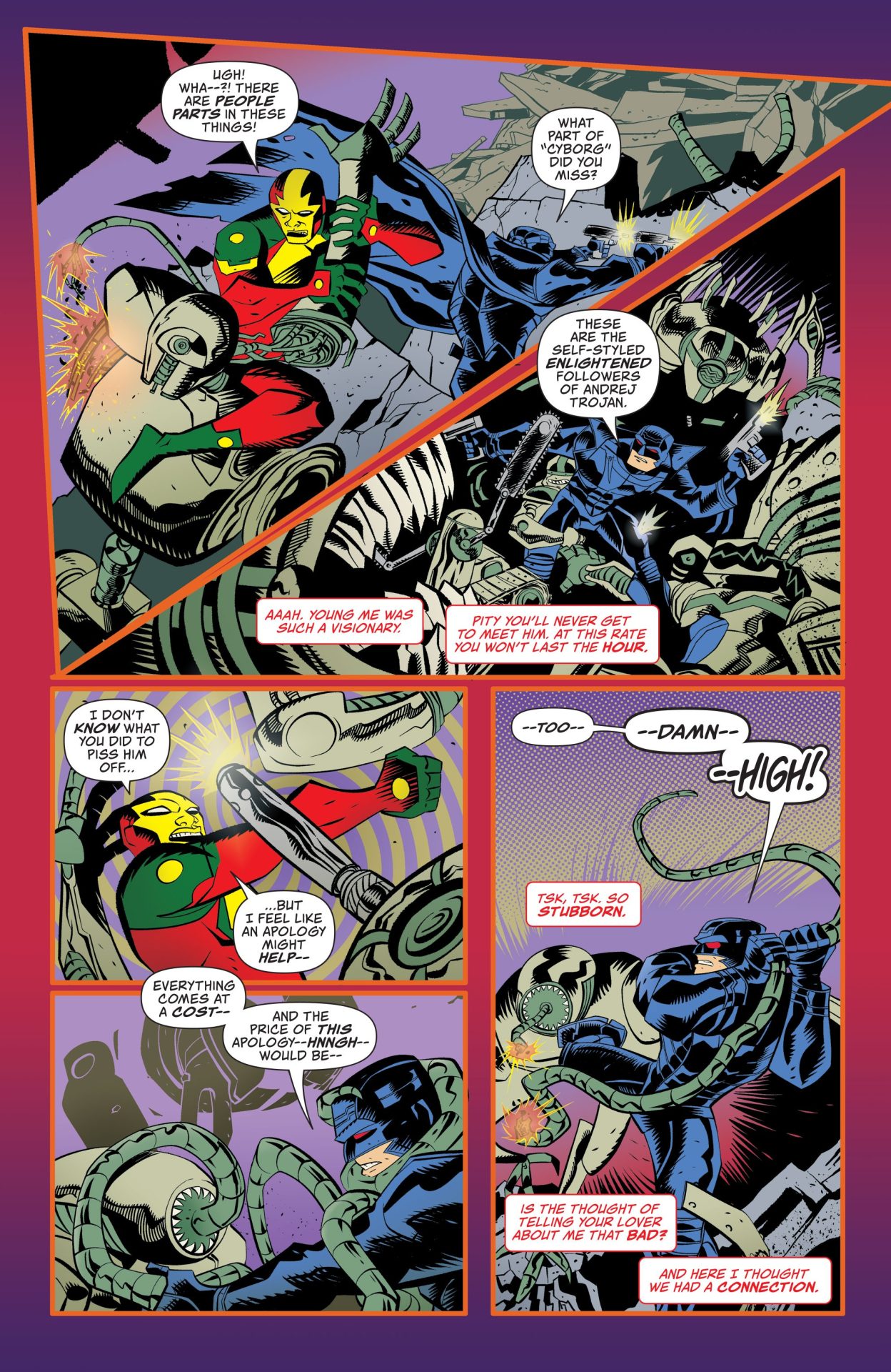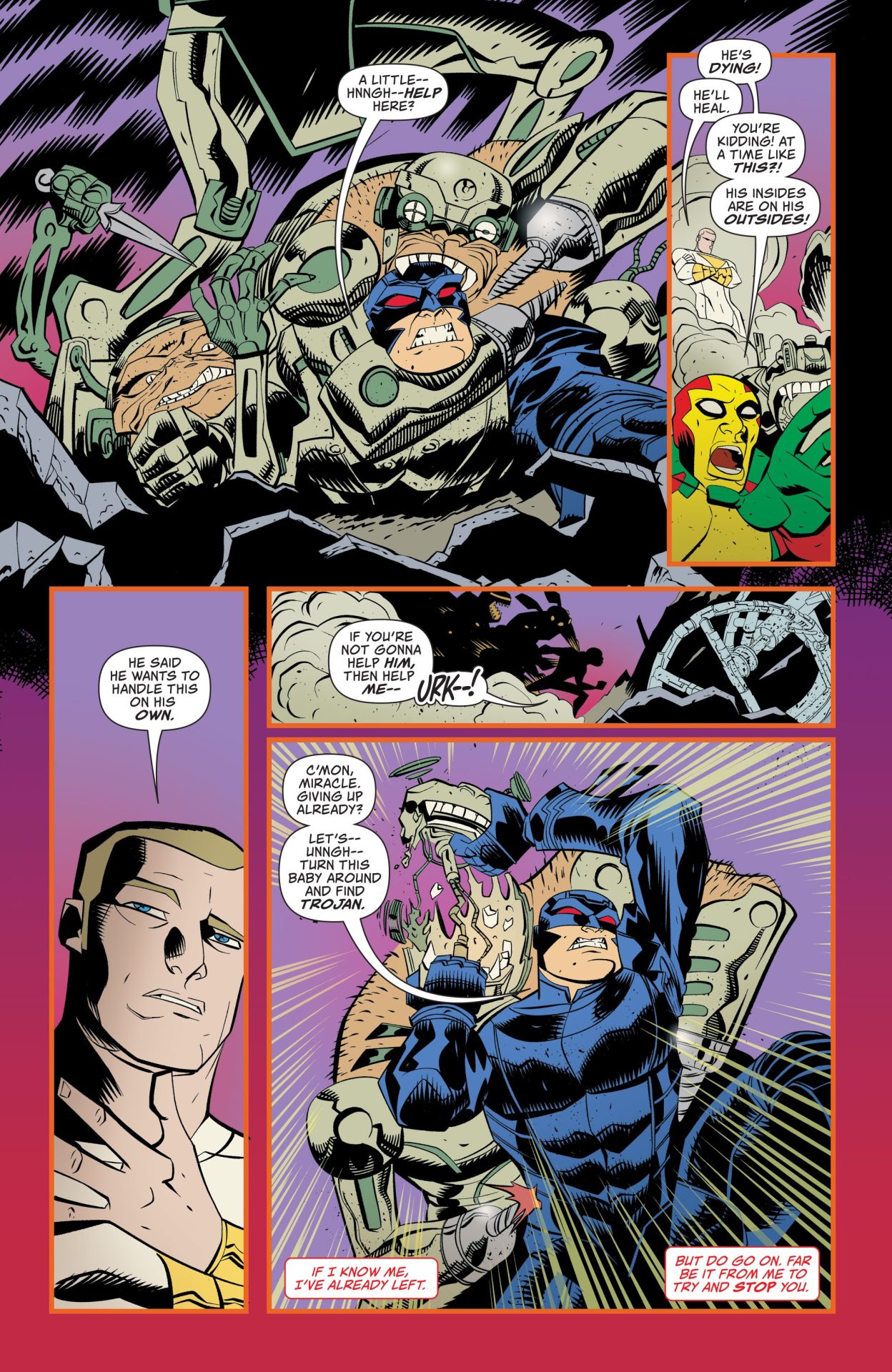 Visually, Midnighter Annual isn’t a DC Comic nor a Wildstorm comic: it’s a Michael Oeming and Taki Soma comic. Their power-packed style with a side of flat colors and slight psychedelic elements is front and center in the book from the first action sequence where Midnighter, Apollo, and Shilo fight off Andrej Trojan’s drones/cultists and remember that Midnighter can teleport anywhere. (He didn’t do this in previous issues because it led to Shilo’s death in multiple timelines.) Oeming’s gift for cartooning brings out the different personalities of the lead characters. This ranges from Apollo casually using his godlike abilities to protect the man he loves to Midnighter relishing in each goon he takes out and Shilo stressing out and quipping like standup comic having an anxiety attack to deal with how out of his depth he is. Although their faces (Except for Apollo and Trojan) are hidden by masks, Michael Avon Oeming makes their faces super expressive in his signature style.