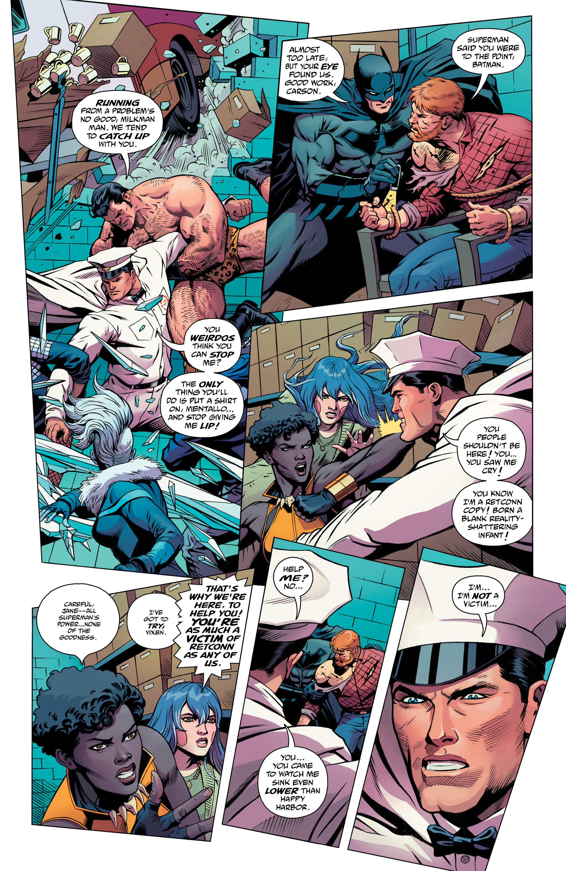 male spandex clad power fantasies” mascot at worst. In his first appearance, Aco goes for pure horror with inset panels of him shoving milk down the throats of an average white Middle America family. This powerful, nearly silent scene played against an idyllic color palette from Bonvillain and Louise is a reminder that even when art claims to be apolitical, just for fun, or not have a message that it, in fact, does have a message. The Retconn Corporation wants to “homogenize” the DC Comics characters, including their classic Trinity, and turn them from powerful icons of justice into basically toys and merchandise as revealed in a couple pages that seem like a “behind the scenes” of a corporate board meeting. Milkman Man’s reaction to reading the actual Action Comics #1 (After yet another gorgeous and meta as hell double page spread from Aco, Bonvillain, and Louise.) is a reminder of how powerful Superman’s origin story is from Way and Orlando, who realize that pop culture can change the world and immigrants get the job done.